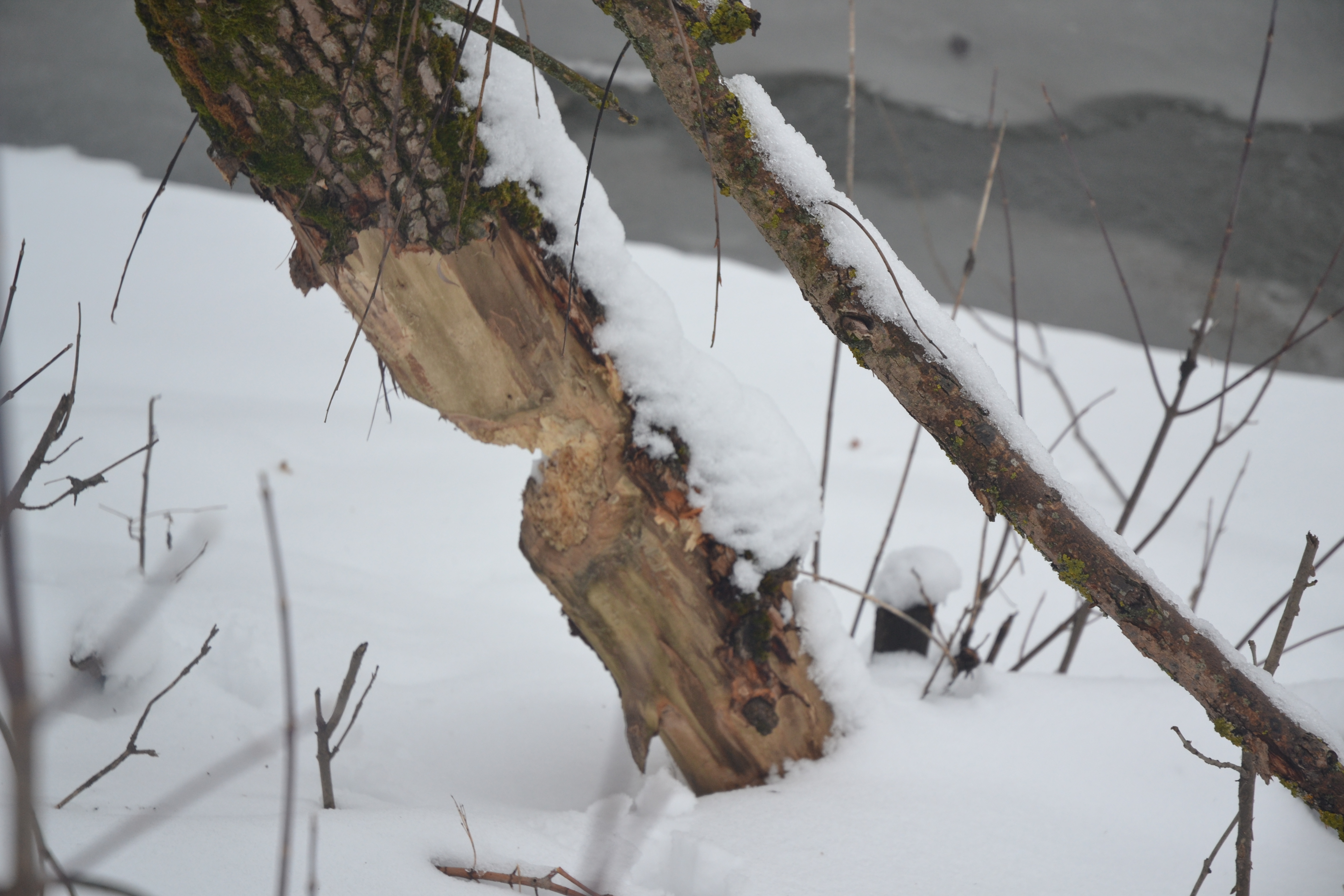 1. Конечно же, Лиана отправилась на Лозовую (было это зимой, когда речка подмёрзла и выпал небольшой снежок), интересно же посмотреть, где живут бобры. Эх, жалко, не повстречала их. Зато нашла много старых и свежих следов: обгрызенных деревьев и оставшихся пеньков, они были заточены совсем как карандаши, а на одном из поваленных деревьев она даже рассмотрела чёткие следы от их зубов.