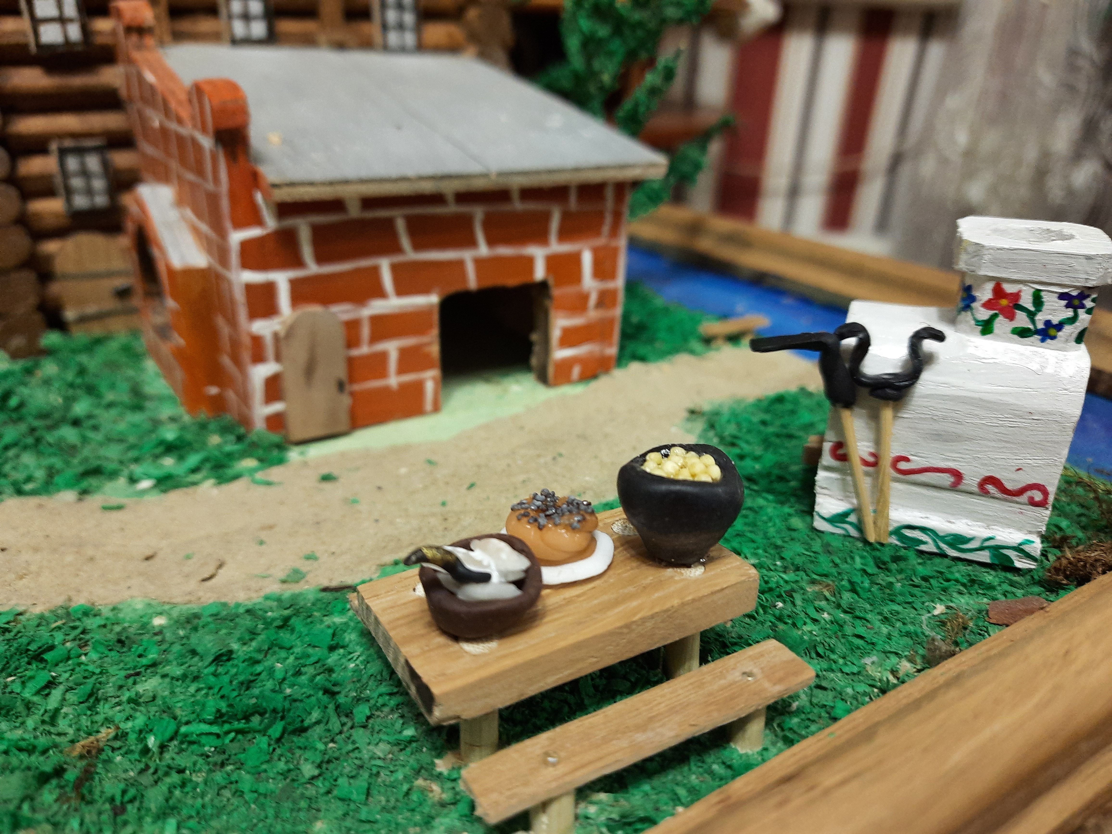 Родителям очень понравилась моя идея, и мы всей семьёй в течение месяца работали над созданием макета. Папа вырезал из дерева дощечки, которые мы с братом склеили между собой – получилось здание мельницы, качели. Затем это всё покрасили, приклеили клеем ПВА окна. Траву, деревья изготовили из окрашенных опилок, дорожку – из песка. Акриловыми красками раскрасила речку, скамейки, мостик, стол, печку и вывеску. Мелкий декор и цветы слепила из полимерной глины. В своей поделке в основном использовала природный материал.