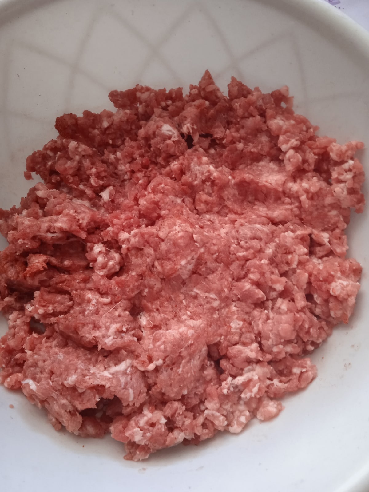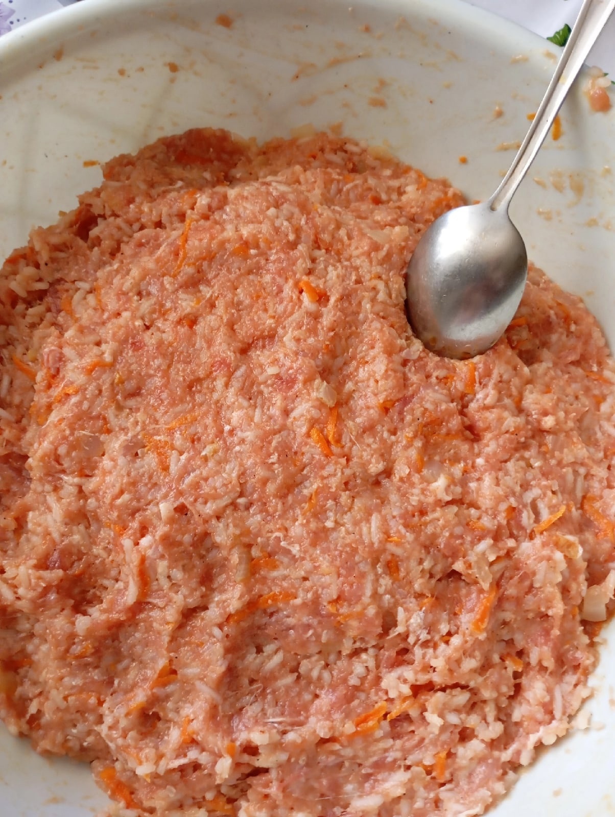 4. Возьмите фарш (куриный или свиной), добавьте к нему сваренный рис и получившуюся зажарку. Всё посолите и поперчите по вкусу, а после хорошенечко перемешайте.