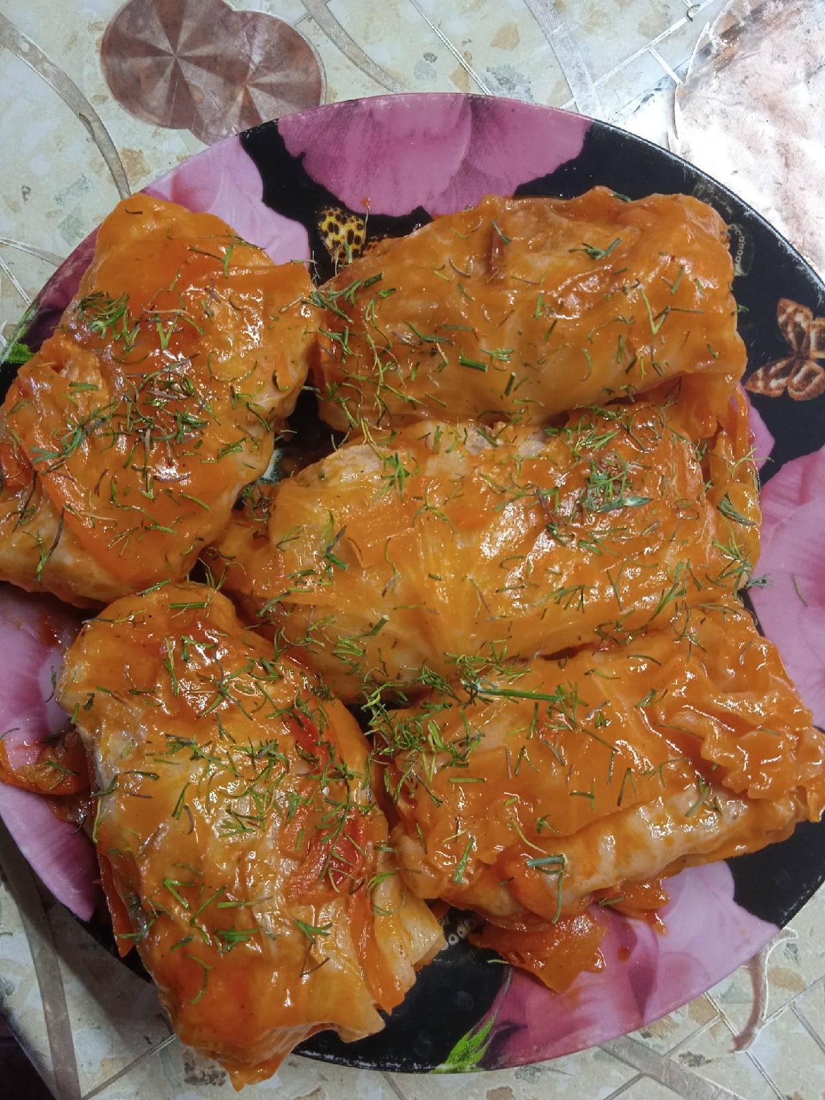8. Всё! Голубцы готовы! Выкладываем их на тарелку и ждём, пока они немного остынут. Кстати, сверху их можно слегка посыпать зеленью. Приятного аппетита!