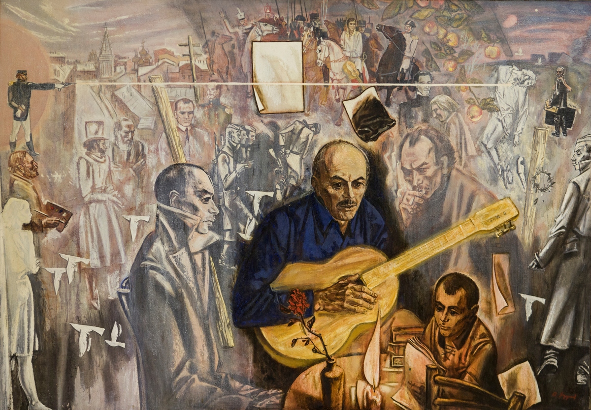 В первом зале находится картина Алексея Худякова «Возьмëмся за руки, друзья. Поэт Булат Окуджава». Она посвящена не только творчеству барда (поэт и музыкант, исполнитель собственных песен) прошлого столетия, но и названа строкой из его песни. Окуджава писал о дружбе, творчестве, судьбе творца.