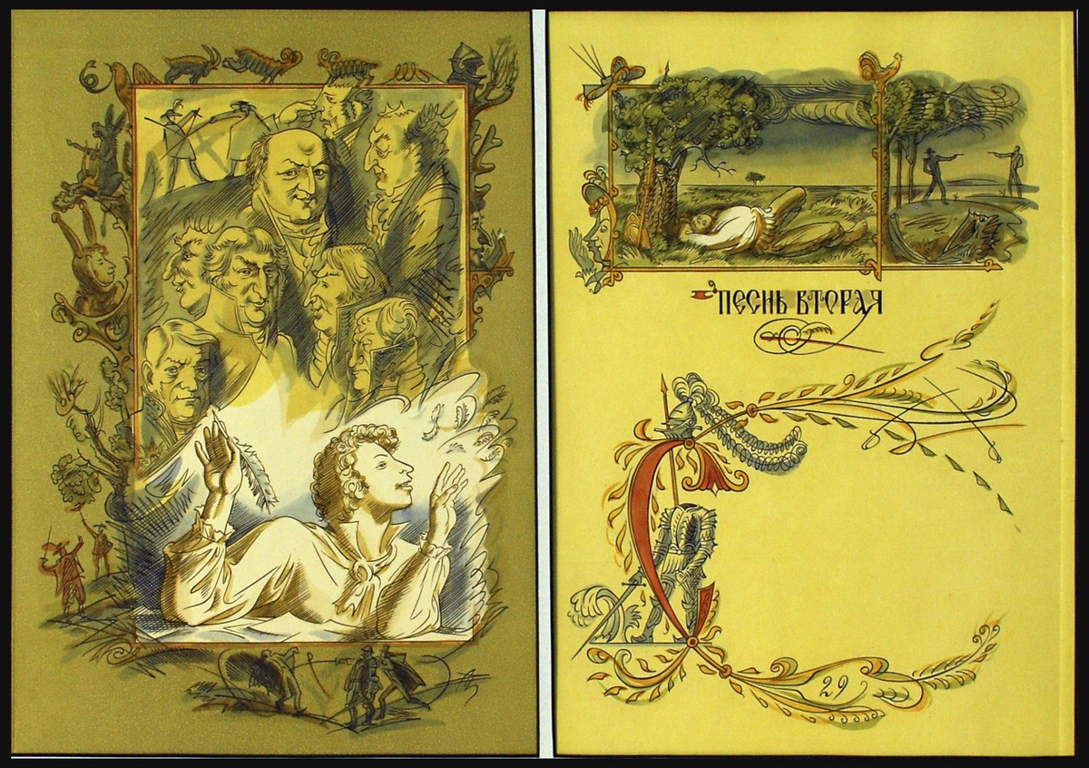 В данном листе поэт изображëн с пером в руке во время творческого процесса. Такой приём, как включение изображения самого Пушкина и предметов его эпохи, значительно обогатил иллюстрации, создал эффект присутствия поэта и связи времён.