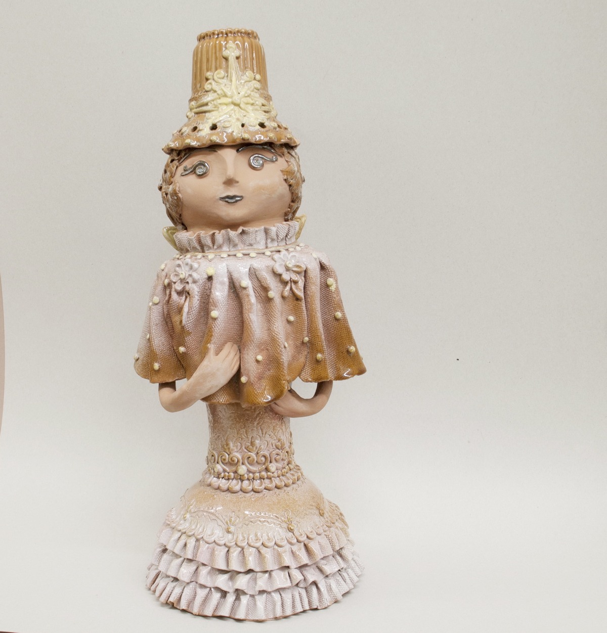 Её персонажи как будто вышли из народных игрушек – наивные и добрые, с широко распахнутыми глазами. Они напоминают купца и купчиху.