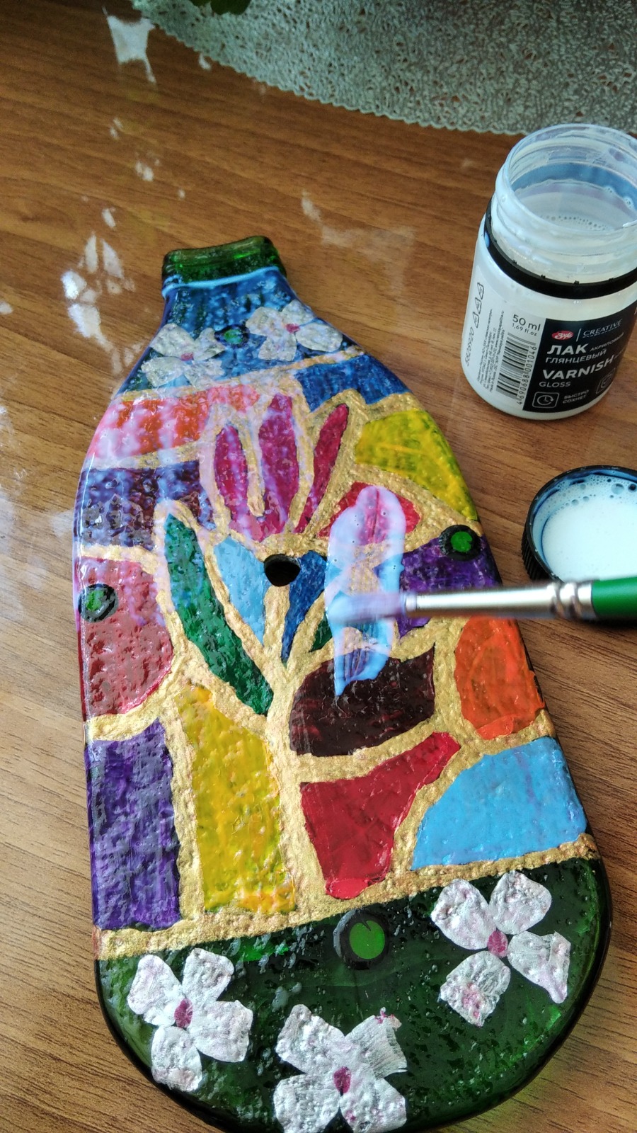 Я сделала трафарет, наклеила его на бутылку. Подготовила самые яркие акриловые краски, раскрасила бутылочку и оставила просохнуть. Затем сняла трафарет и покрасила все стыки золотым акрилом. Чтобы закрепить свою работу, я покрыла рисунок двумя слоями лака. И вот передо мной уже красота!