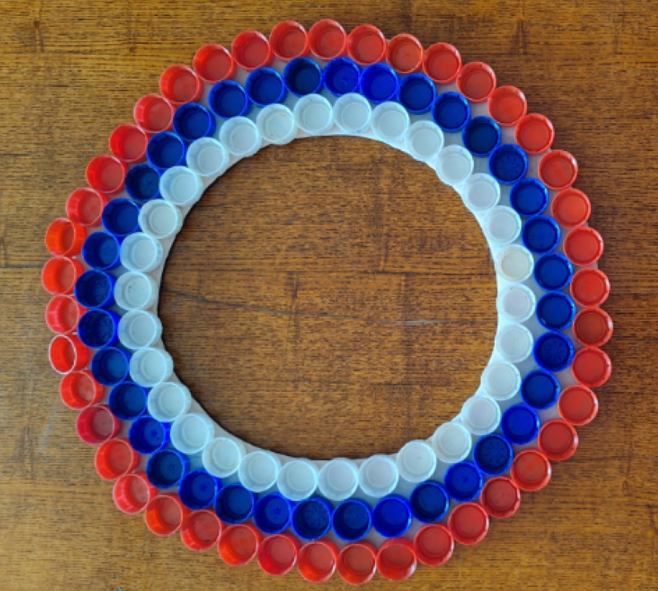 3. С помощью клея приклеиваем крышки к венку, начиная от внутреннего круга: белая крышка, далее – синяя, после – красная.