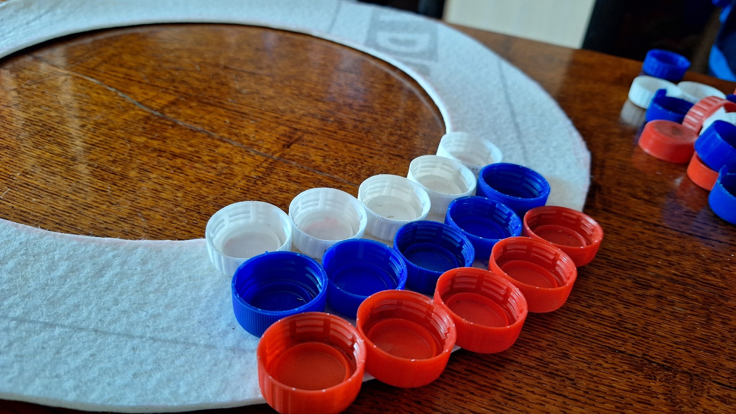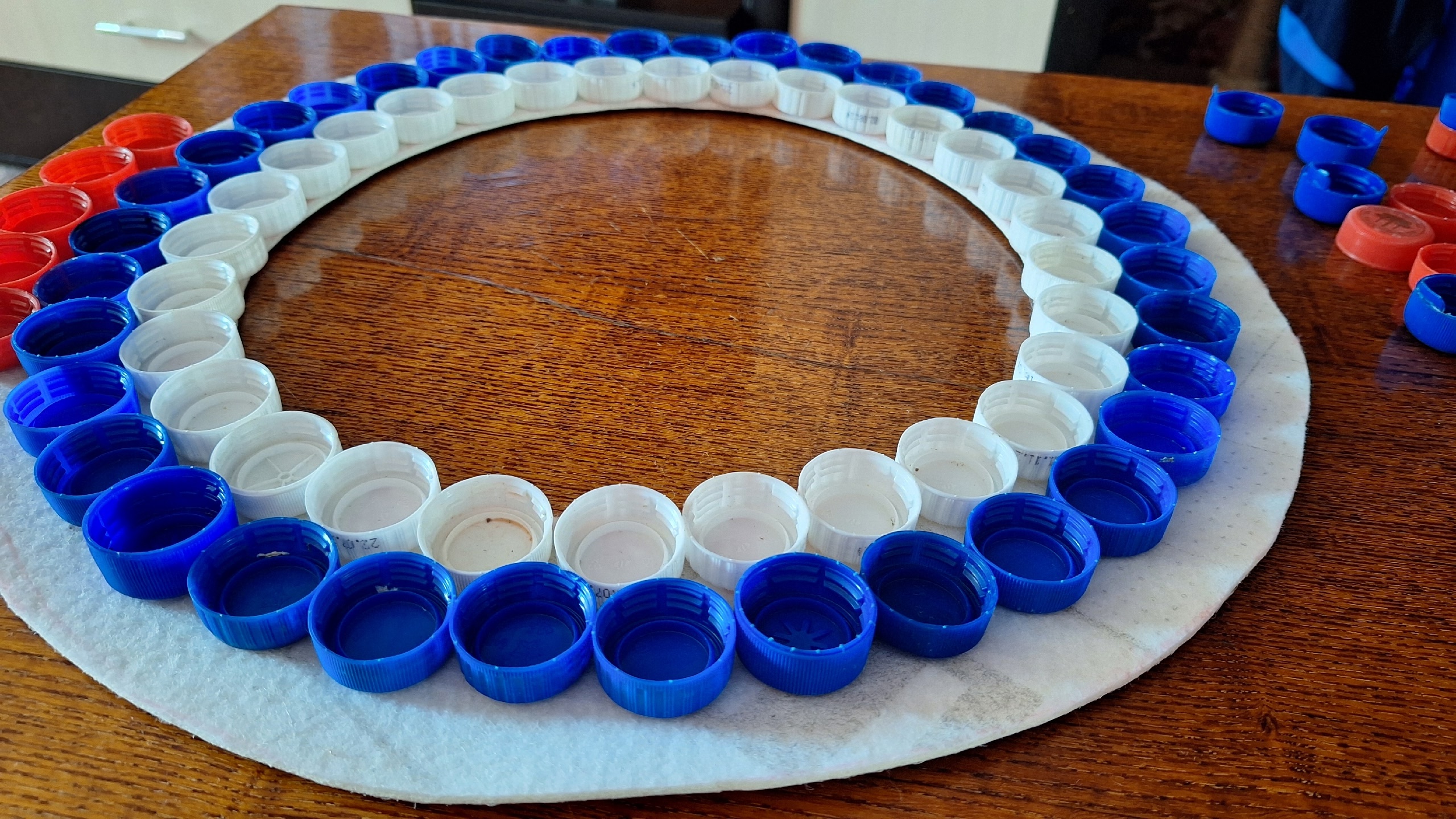 4. Теперь можно приступать к поклейке крышек рядами. Отбираем крышки по цвету и проклеиваем сначала белый ряд, затем синий и красный.