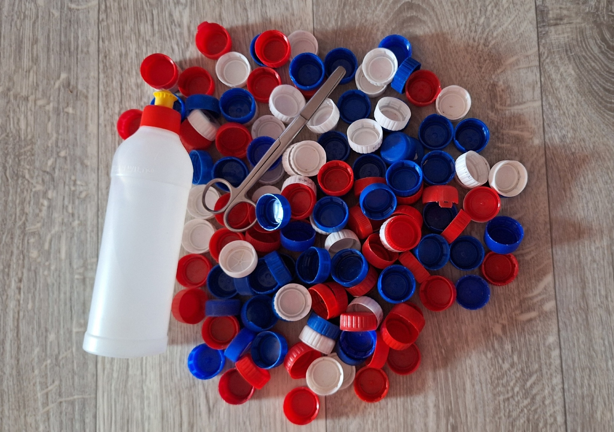 - Пластиковые крышки от бутылок: белые – 30 шт., синие — 36, красные — 42;