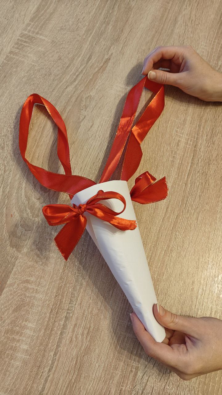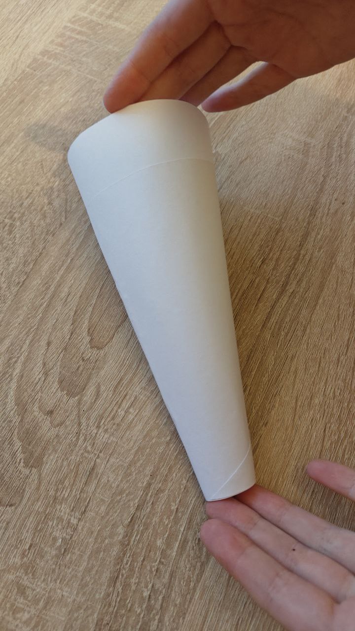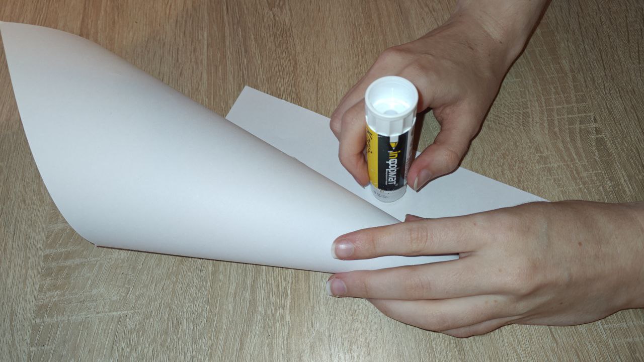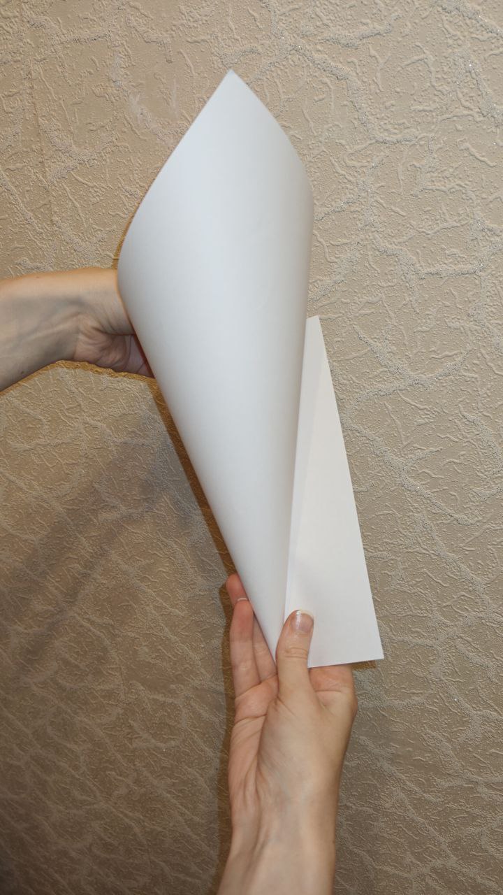Сверните лист формата А4, формируя конус (следуйте фотопримеру). Место стыка хорошо проклейте клеем-карандашом. НА ЗАМЕТКУ! Вы можете взять белый лист бумаги или же любого другого цвета, который будет хорошо сочетаться с оттенками вашего цветочного букета.