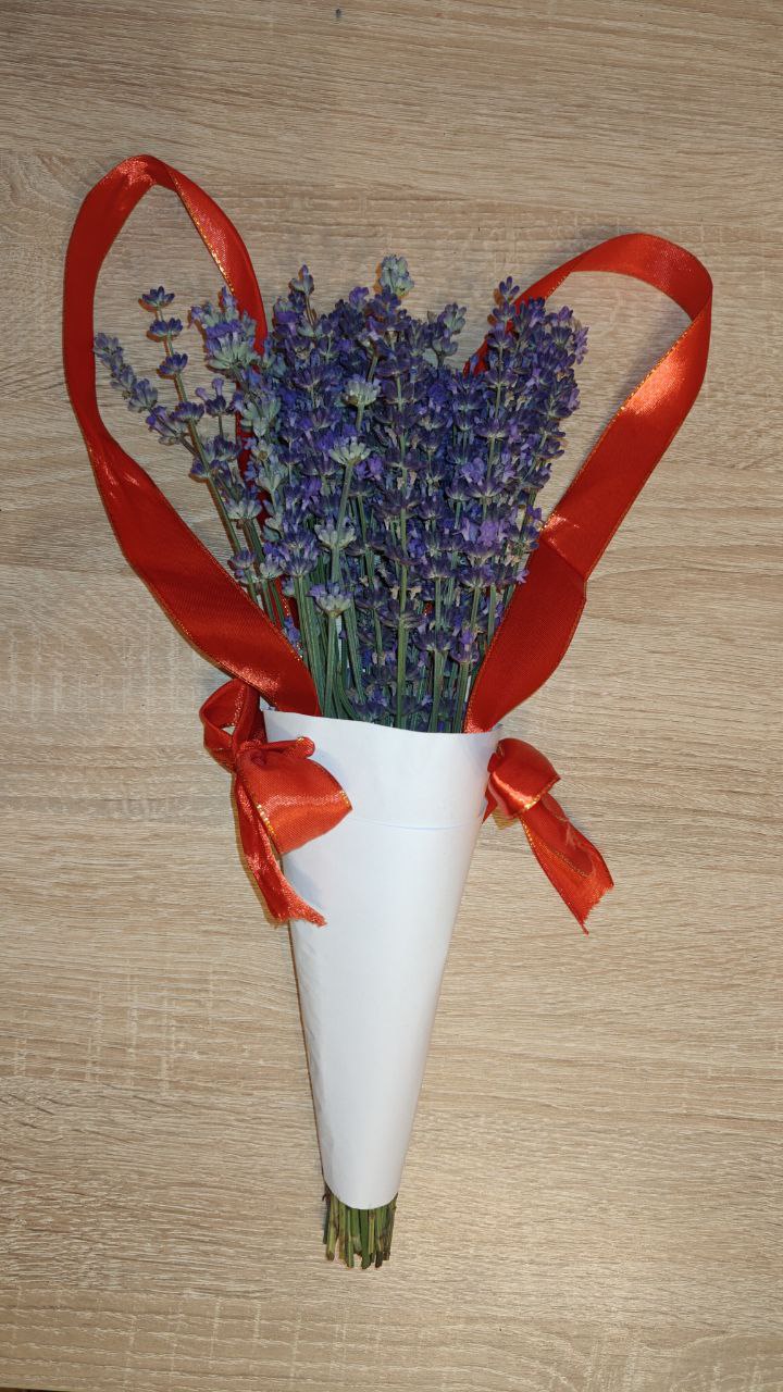 Из лаванды (или любых других цветов, которые вы захотите взять или найдёте в своём саду) сформируйте букетик подходящей длины и поместите его в корзинку. Не забудьте предварительно удалить у цветов листья. ИМЕЙТЕ В ВИДУ! Если вам кажется, что пропорции корзинки и цветов не подходят друг другу (к примеру, букетик слишком большой), вы всегда можете или слегка обрезать стебли ваших цветов, или же немного расширить корзинку внизу, срезав лишнюю бумагу.