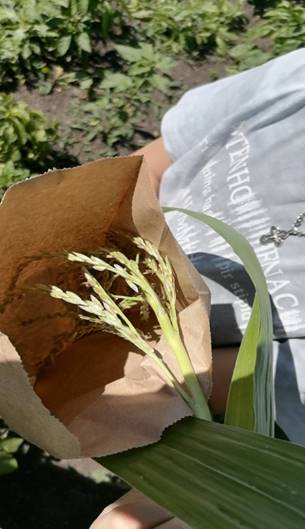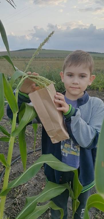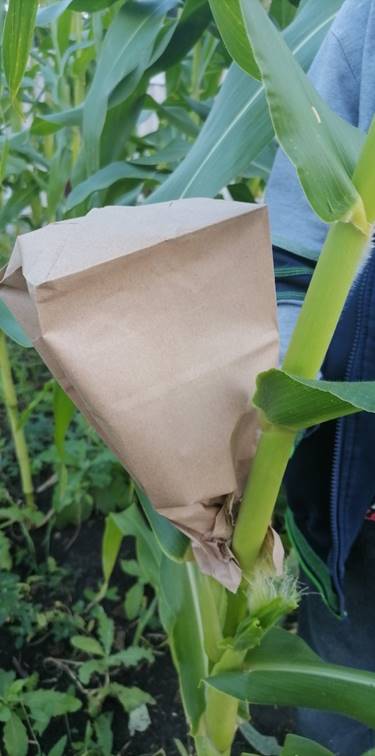 «Для получения самоопылённого початка пыльцу собирают с метёлки и помещают на початок того же самого растения с помощью крафтового пакета. Початки закрывают крафт-пакетами с пыльцой. В это время происходит опыление. Метёлки можно удалить, а пакеты собрать спустя 48–72 часов после опыления», — поясняет юный исследователь.