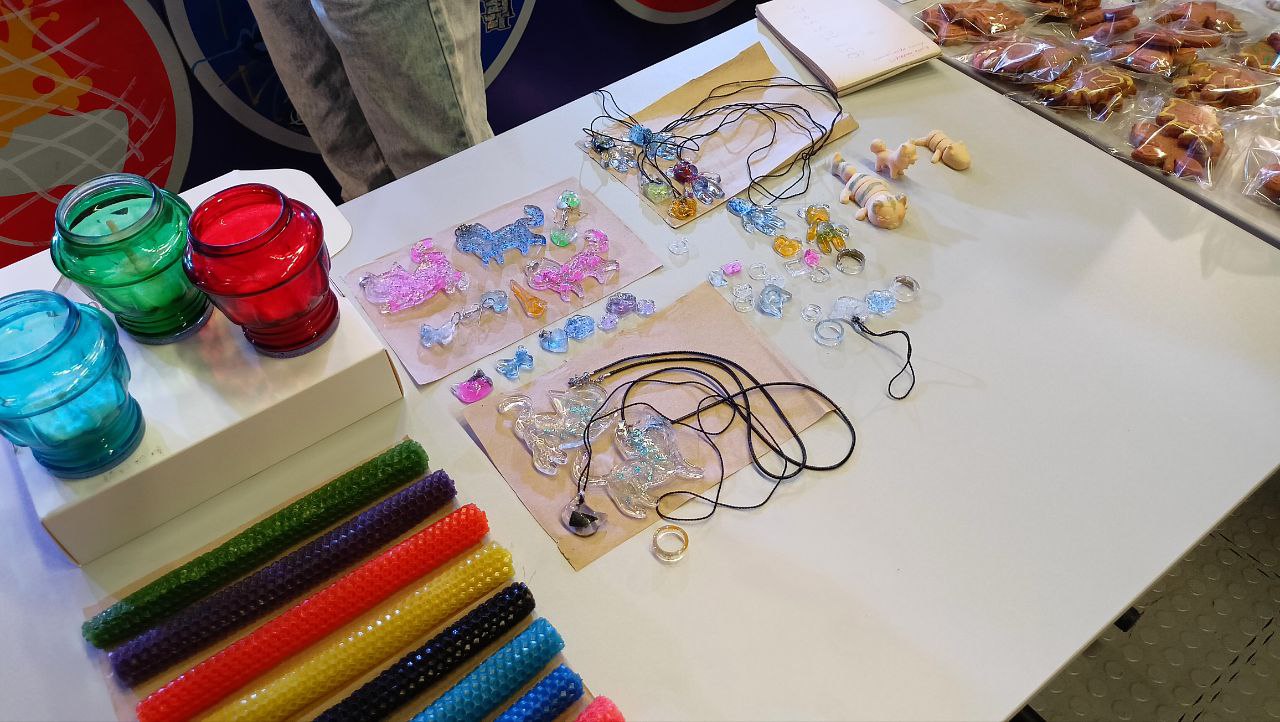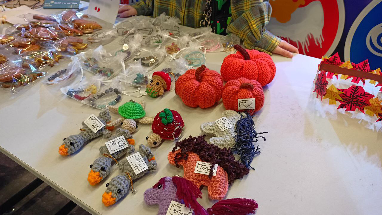В этот раз у ярмарки была осенняя тематика. На столах: украшения, вязаные игрушки и брелоки, леденцы, ароматная выпечка, а кто‑то даже принёс комнатные растения. Всё сделано и выращено своими руками.