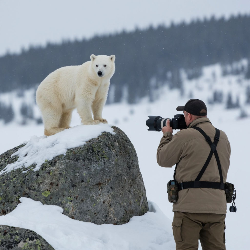 Однажды, ещё в начале съёмок, когда медведей почти не было, один из них подошёл к кораблю. Все выскочили на палубу к гостю. А Никита Михалков, взяв банку сгущёнки, вдруг спустился по трапу… Повезло, что медведь стоял спиной. Обернулся он в тот момент, когда Никита ставил банку на лёд. Медведь сделал девятиметровый прыжок. Михалков бросился к трапу, медведь за ним, но когти соскользнули. Это и спасло. Трап быстро подняли. Близкое знакомство с медведем помогло затем Михалкову сыграть свою роль, когда по сценарию медведь должен был подойти к палатке. Ни один из настоящих мишек «не желал» сниматься, в медвежью шкуру вынуждены были наряжать дублёра, но это также не дало результата. Тогда добровольцем вызвался Михалков, внимательно наблюдавший и тем самым изучивший повадки медведей. Сцена получилась. А Никита Михалков, по большому счёту, в этом фильме сыграл две роли — полярного лётчика и полярного медведя.