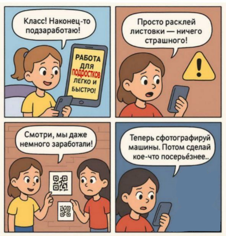 Она поделилась с ребятами примерами из практики, объяснив, к каким последствиям может привести легкомыслие в сети: от эмоциональной травмы при кибербуллинге до серьёзных финансовых потерь при краже данных. А реальный кейс про «лёгкие деньги» лёг в основу сюжета, сделав комикс по‑настоящему полезным.