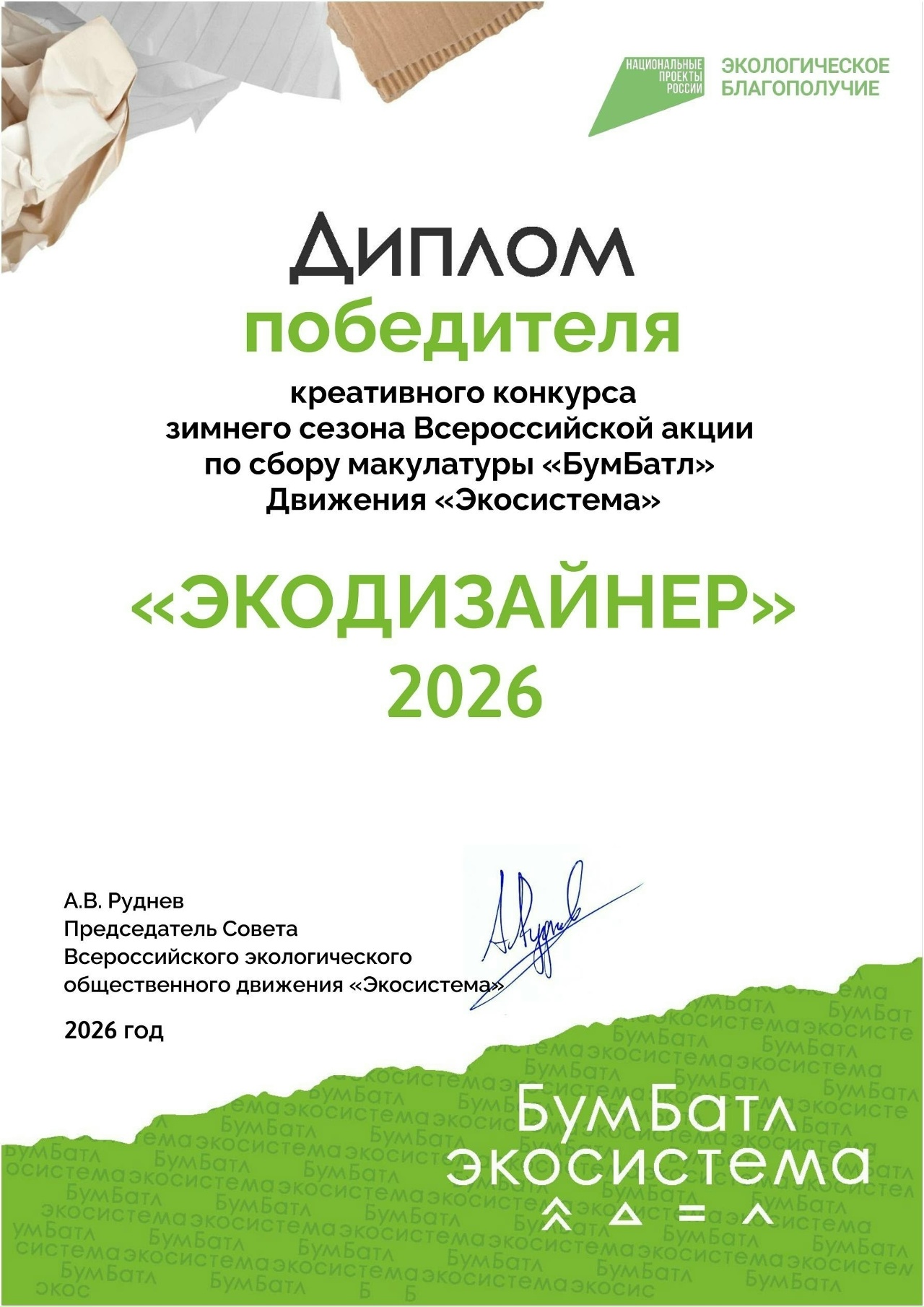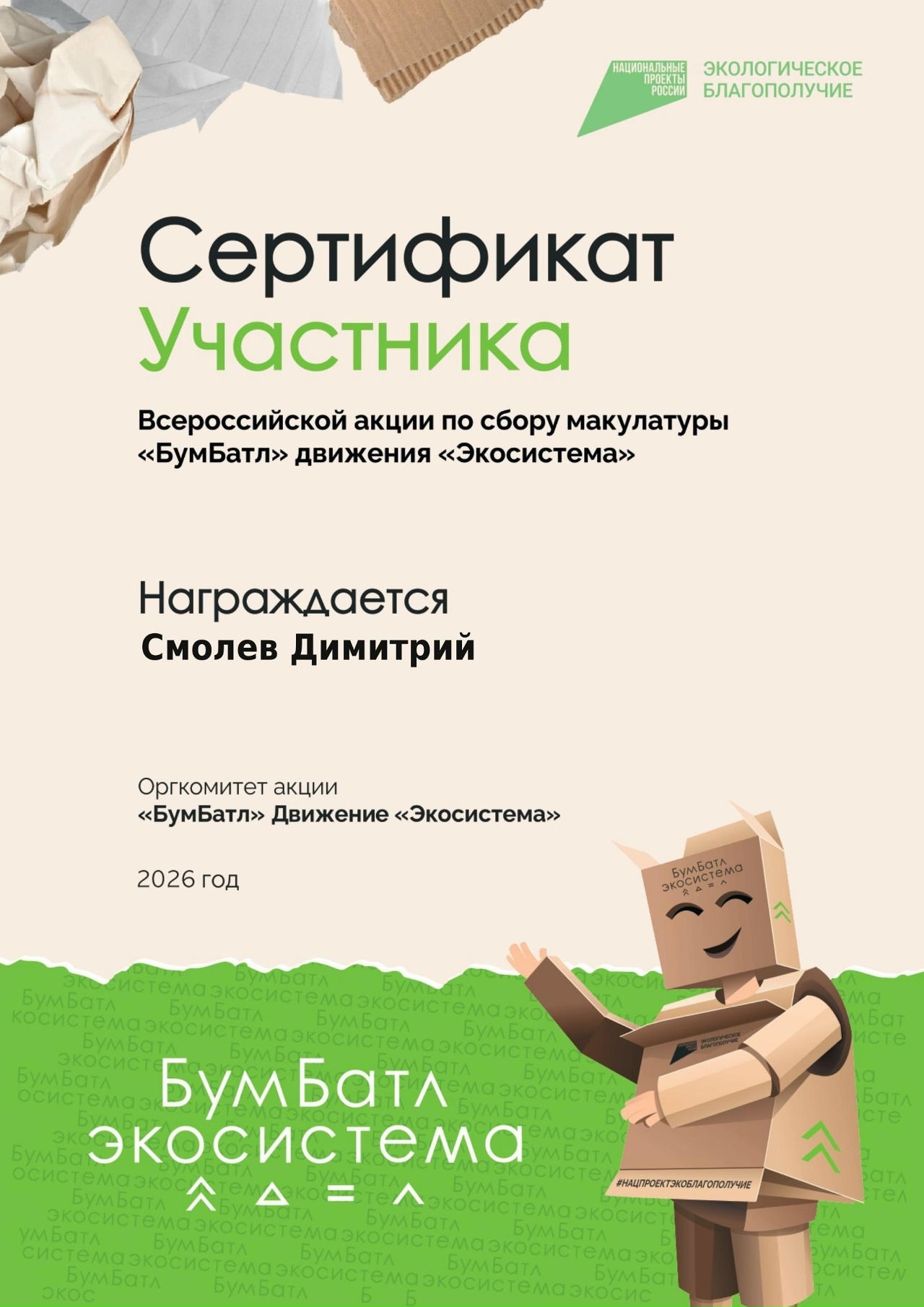 Всероссийская акция «БумБатл» по сбору макулатуры проводится в рамках нацпроекта «Экологическое благополучие» при поддержке экологического общественного движения «Экосистема». Ключевая цель – сокращение излишнего потребления бумаги и формирование культуры обращения с отходами.