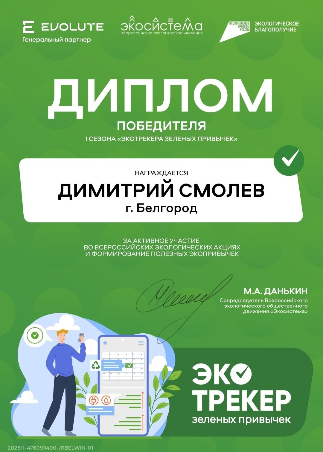В течение всего экотрекера выставлялся рейтинг. Завершённых заданий у меня было 50, в рейтинге всех участников я был на 10 месте, а из Белгородской области стал первым. Получил 370 баллов.