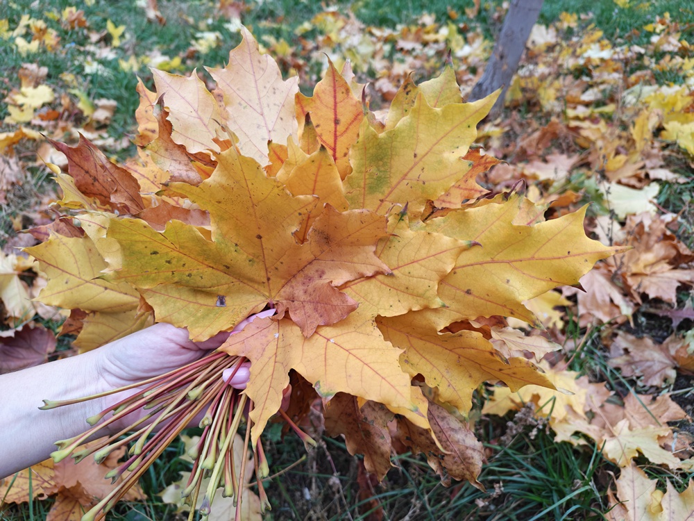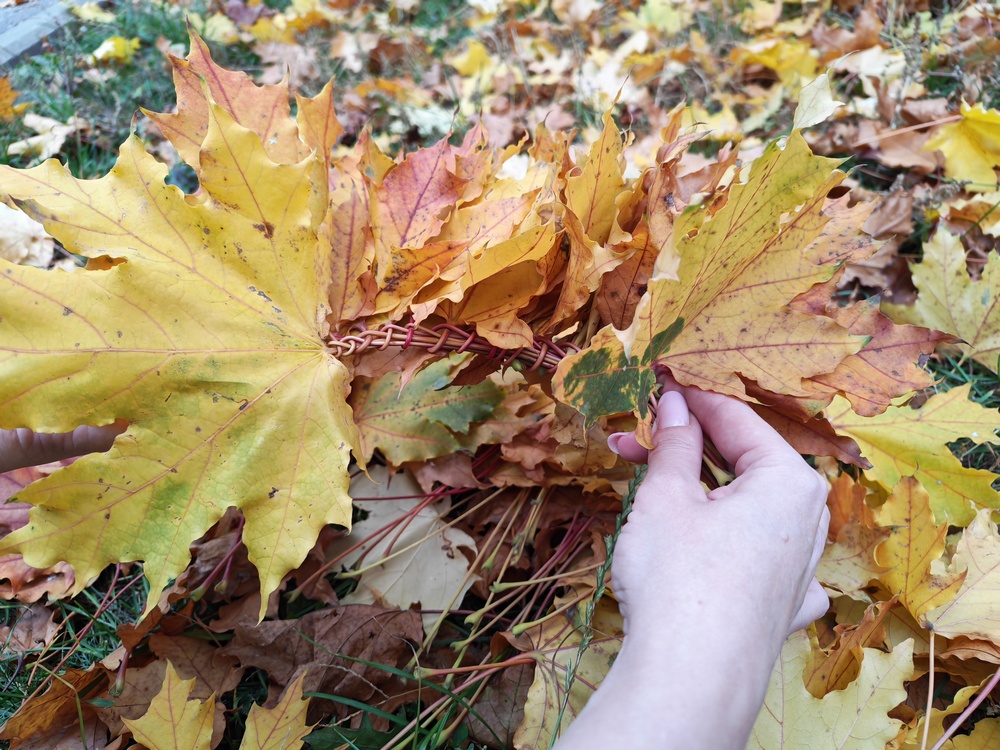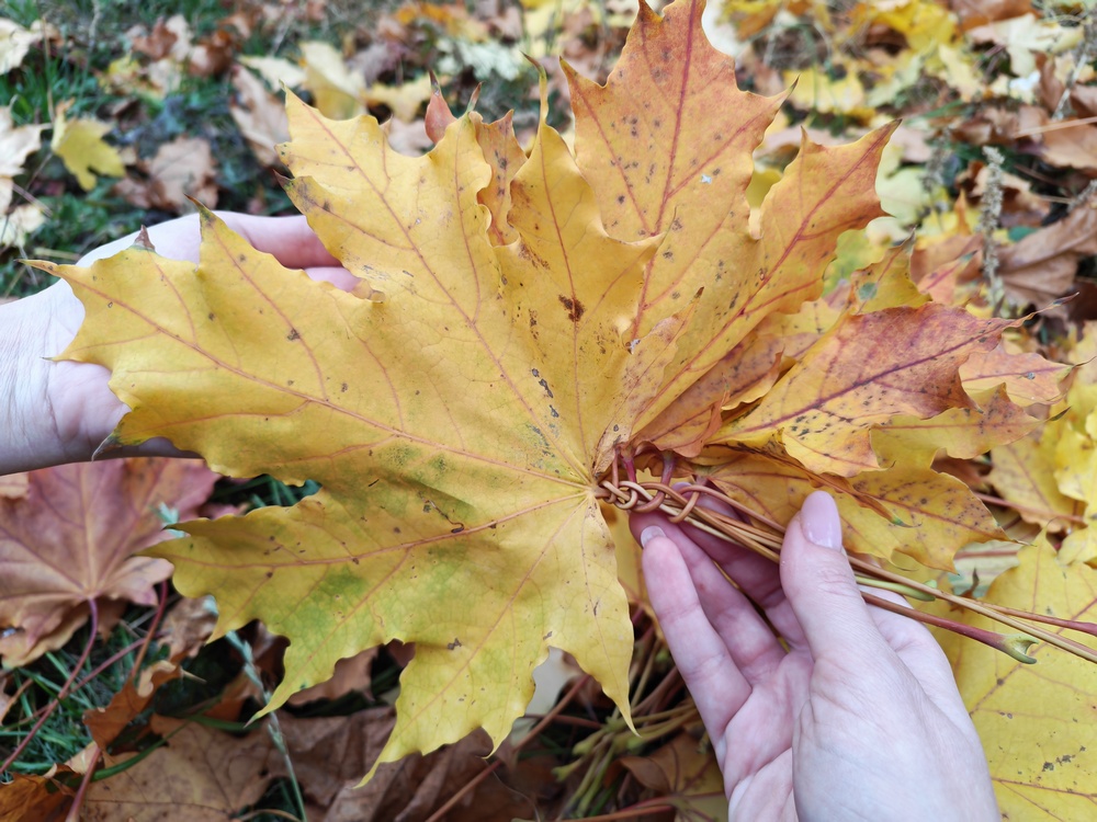 Чтобы вам было удобнее плести венок, выбирайте кленовые листы с длинными черешками.