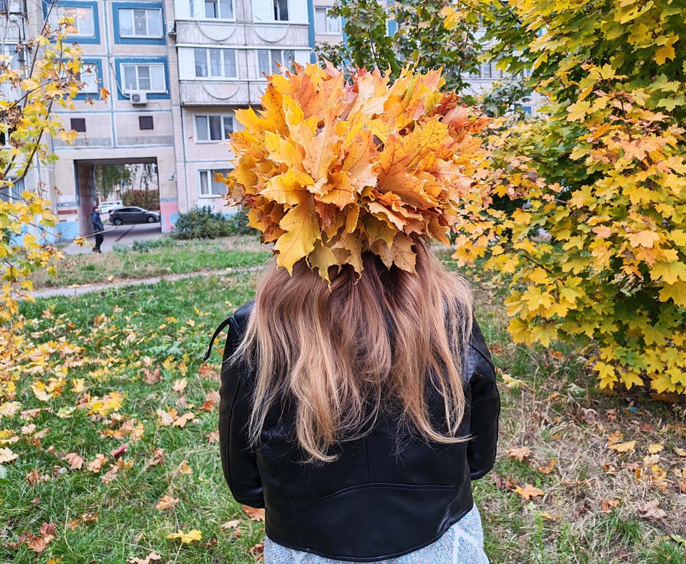 Всё! Венок из кленовых листьев готов! Что с ним делать? Можно устроить настоящую фотосессию в нём, сделав много-много памятных осенних фото. Также яркий аксессуар может пригодиться на тематический осенний утренник в школе или детском саду. Ну а можно как украшение повесить его в своей комнате. А чтобы листы подольше сохранили свой первозданный вид, их можно сбрызнуть обычным лаком для волос.