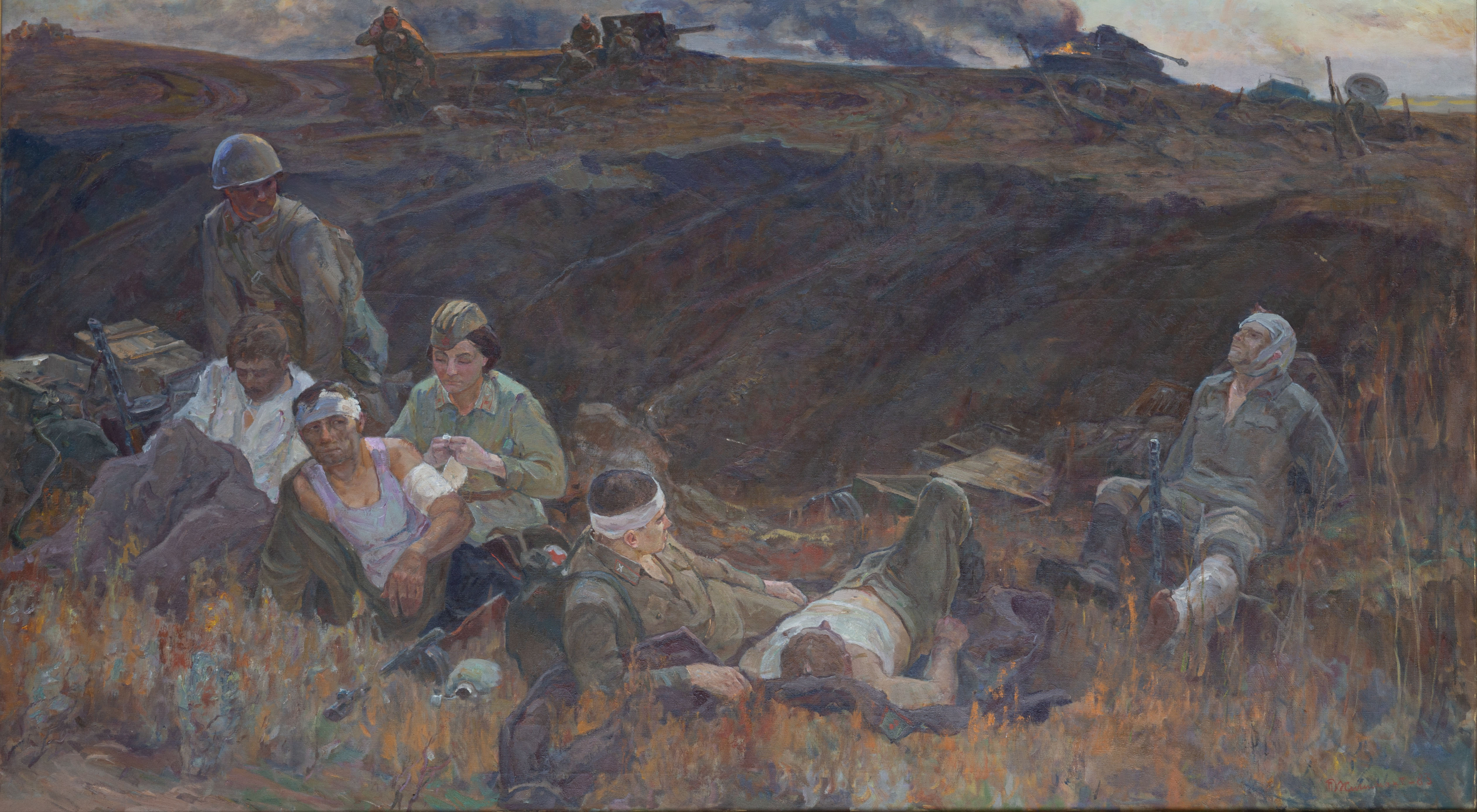 Страдание героев, их терпение – символ мужества и стойкости советских солдат. Склон холма, словно прикрывающий наших воинов, является смысловой доминантой работы – будто сама родная земля оберегает наших бойцов. Колористический строй полотна, решенный в приглушенной палитре неброских охристых оттенков пожухлой и выжженной травы, усиливает эмоционально-образный строй картины. В кажущейся сдержанности выразительных средств заключена большая сила эмоционального воздействия.