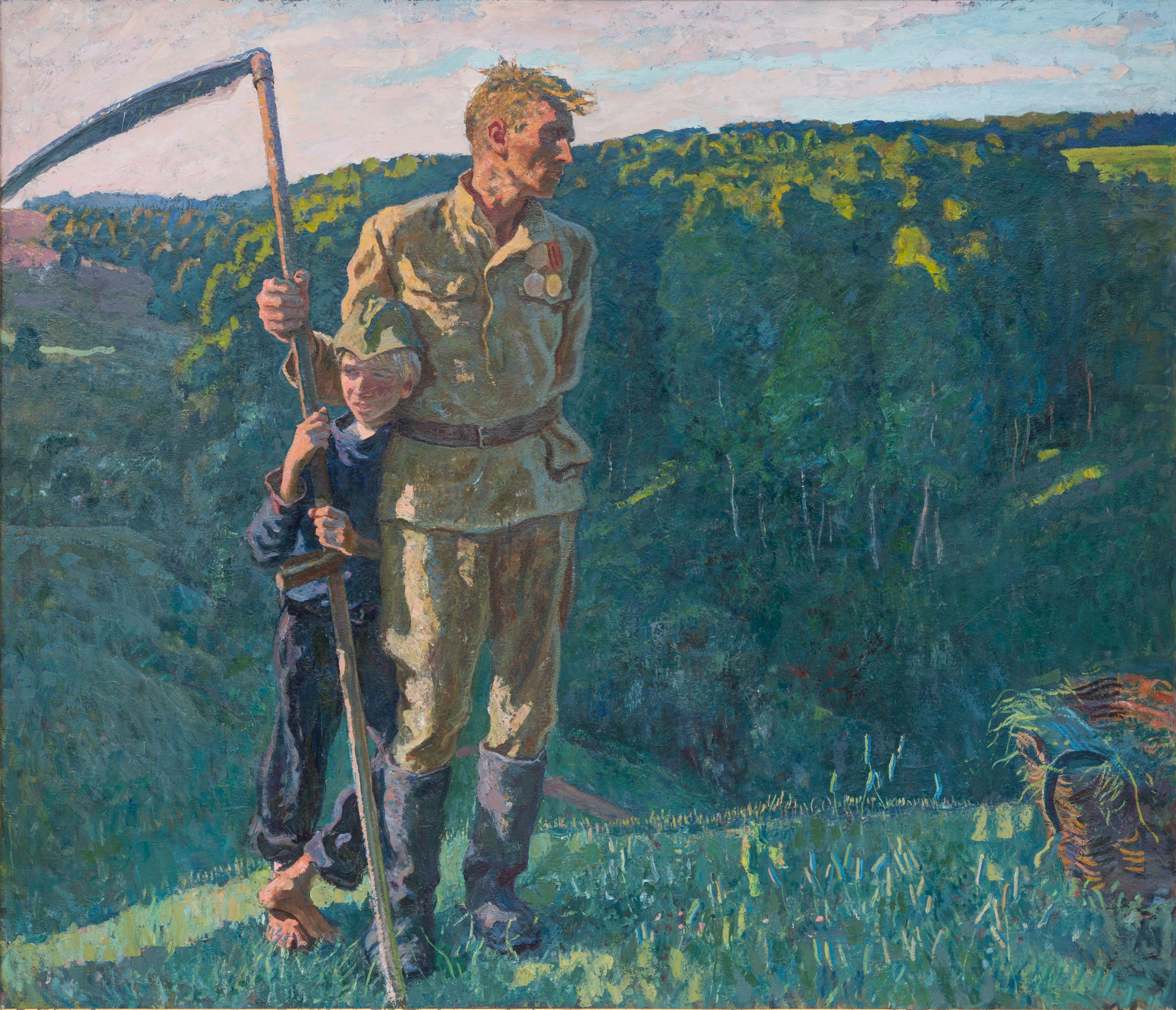 Одна работа на выставке – «Косцы» – отражает мирную жизнь селян, вторая — «Пришёл солдат с войны» — отсылает к послевоенному времени. В центре картины на фоне необъятных зеленых просторов возвышается монументальная фигура бывшего солдата, пришедшего с фронта искалеченным, его сынишка трогательно приник к отцу. Символичен жест трёх рук, сжимающих рукоять косы, этот жест воспринимается как передача трудовой эстафеты, ведь именно мальчишке придется работать на земле, которую освобождал его отец.