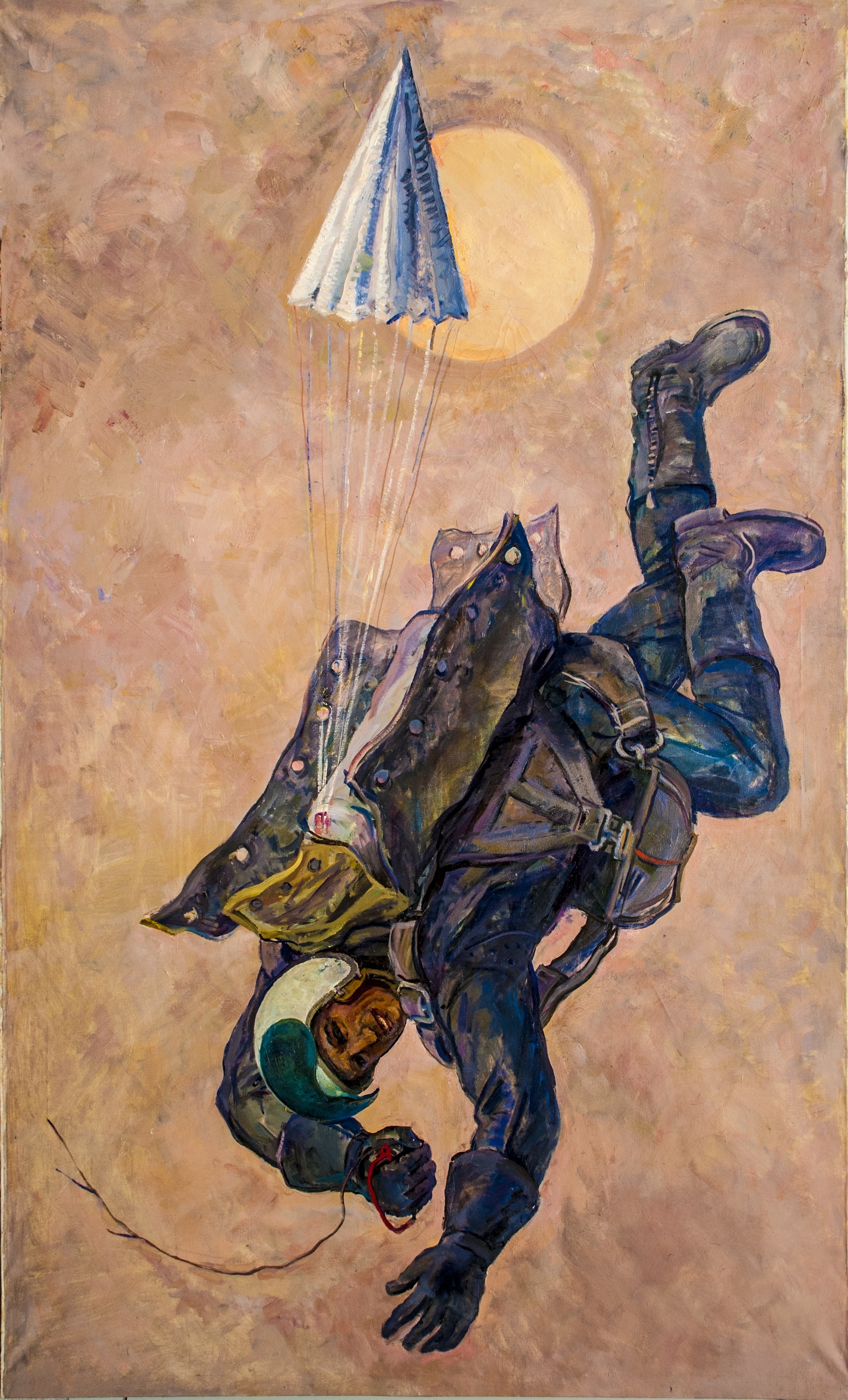 На экспозиции представлено несколько произведений мастеров Студии военных художников имени М. Б. Грекова, среди них и крупноформатное полотно Владимира Переяславца «Испытатель Герой Советского Союза полковник Романенко И. Г.». В этой профессии нужно действительно иметь и мужество, и смелость и крепость духа. На картине советский лётчик-истребитель и военачальник, участник советско-финской, Великой Отечественной и советско-японской войн, Герой Советского Союза (21.04.1940), генерал-лейтенант авиации (25.05.1959) изображён в прыжке с парашютом, в сложном ракурсе и колорите.