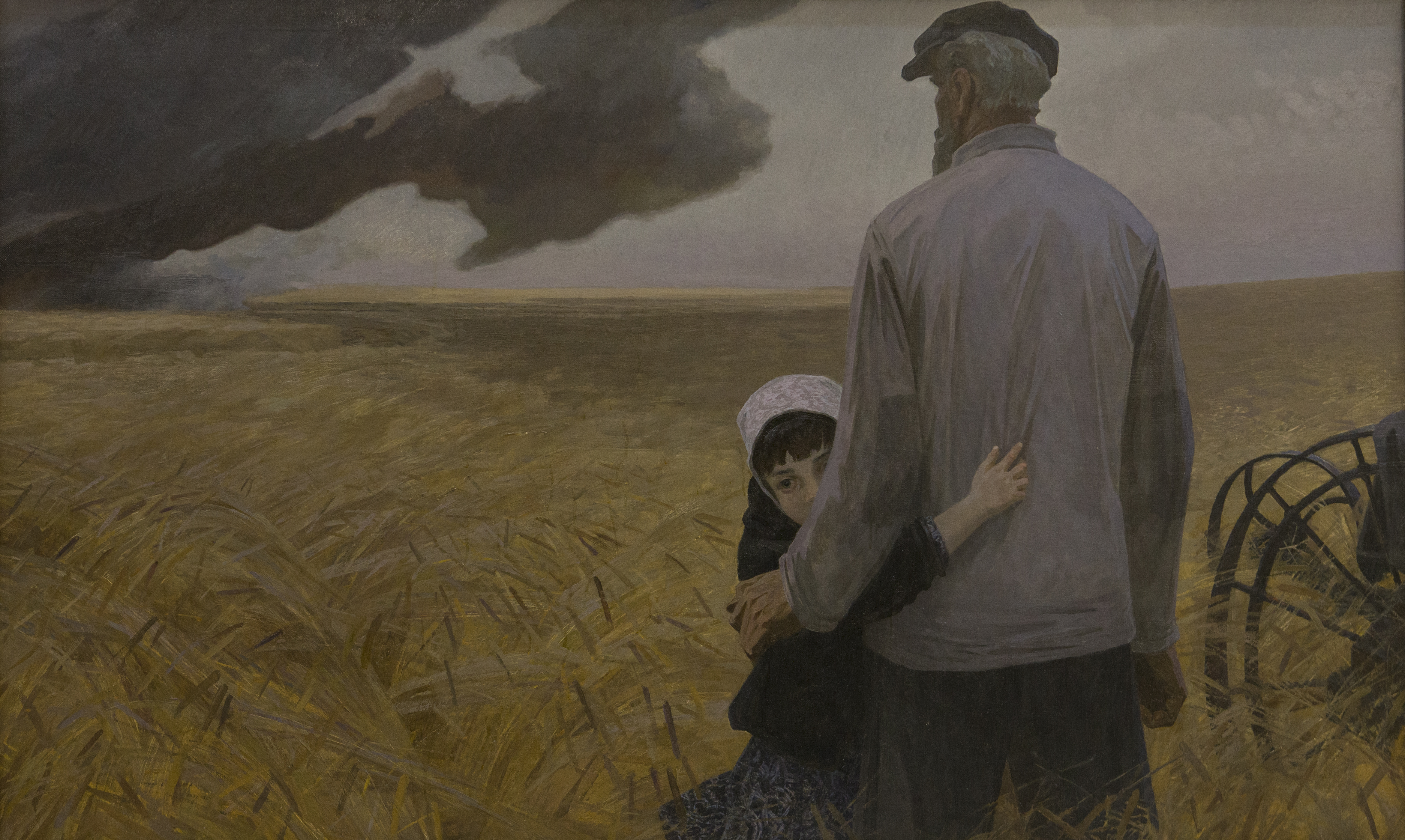 Лето 1941 года… Первые месяцы войны, отходят наши части, горят золотые пшеничные поля, на горизонте, почти закрывая небо, вздымаются черные клубы дыма. Оставшиеся в деревнях старики и дети не могут спасти богатый урожай. В картине Алексея Михайлова с максимальным драматизмом показаны переживания, неподдельное горе крестьянина, вынужденного перед угрозой пожара отставить плуг в сторону. Контраст огромного горящего поля и человека, его хозяина, с испуганно прильнувшей к нему внучкой – усиливает драматизм происходящего. Поза старика, стоящего спиной к зрителю, вся его монументальная фигура, возвышающаяся над полем, выражает несгибаемость характера и крепость духа. При минимальном арсенале живописно-пластических средств (обобщенный рисунок, сдержанный колорит) художник добивается необыкновенной выразительной силы.
