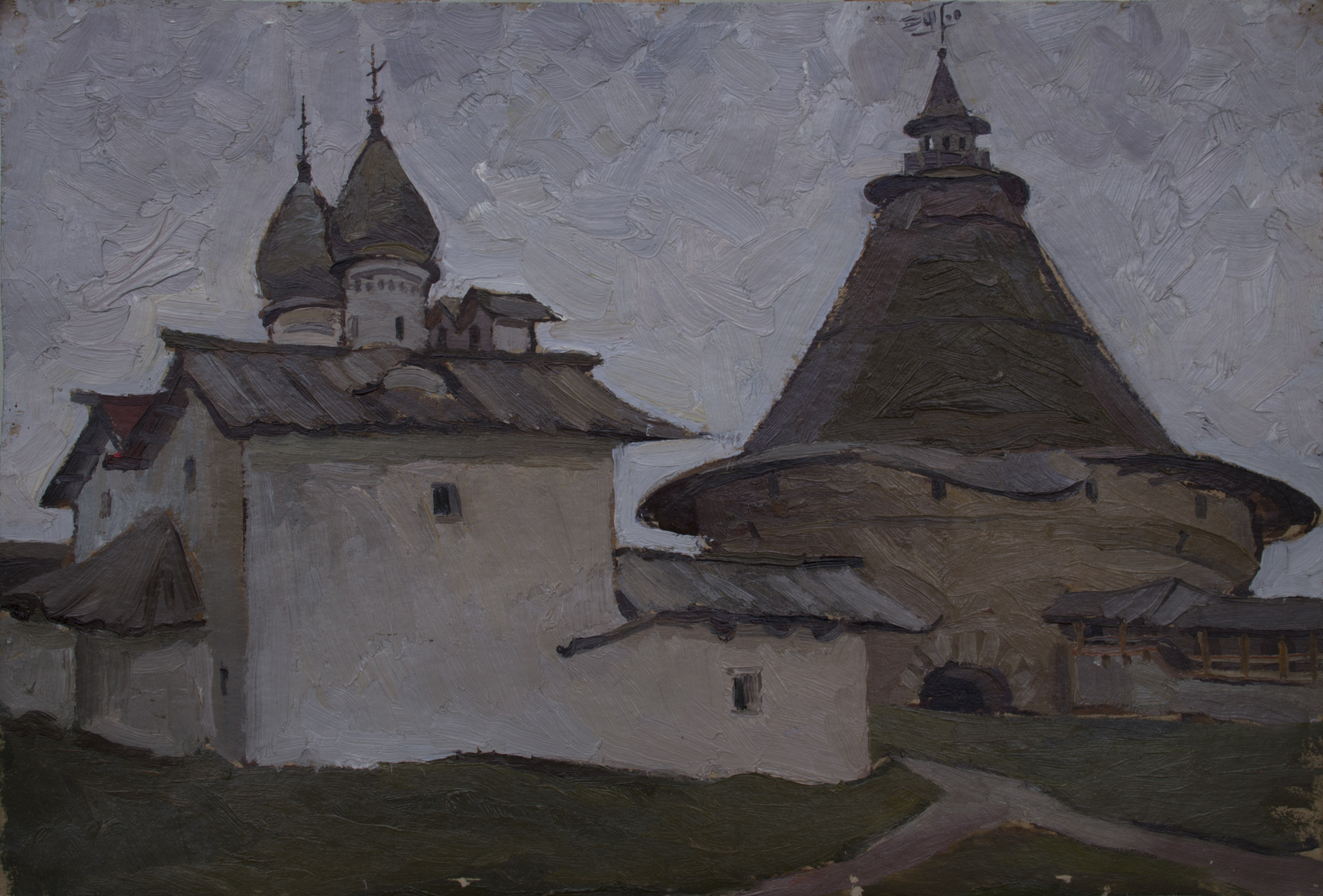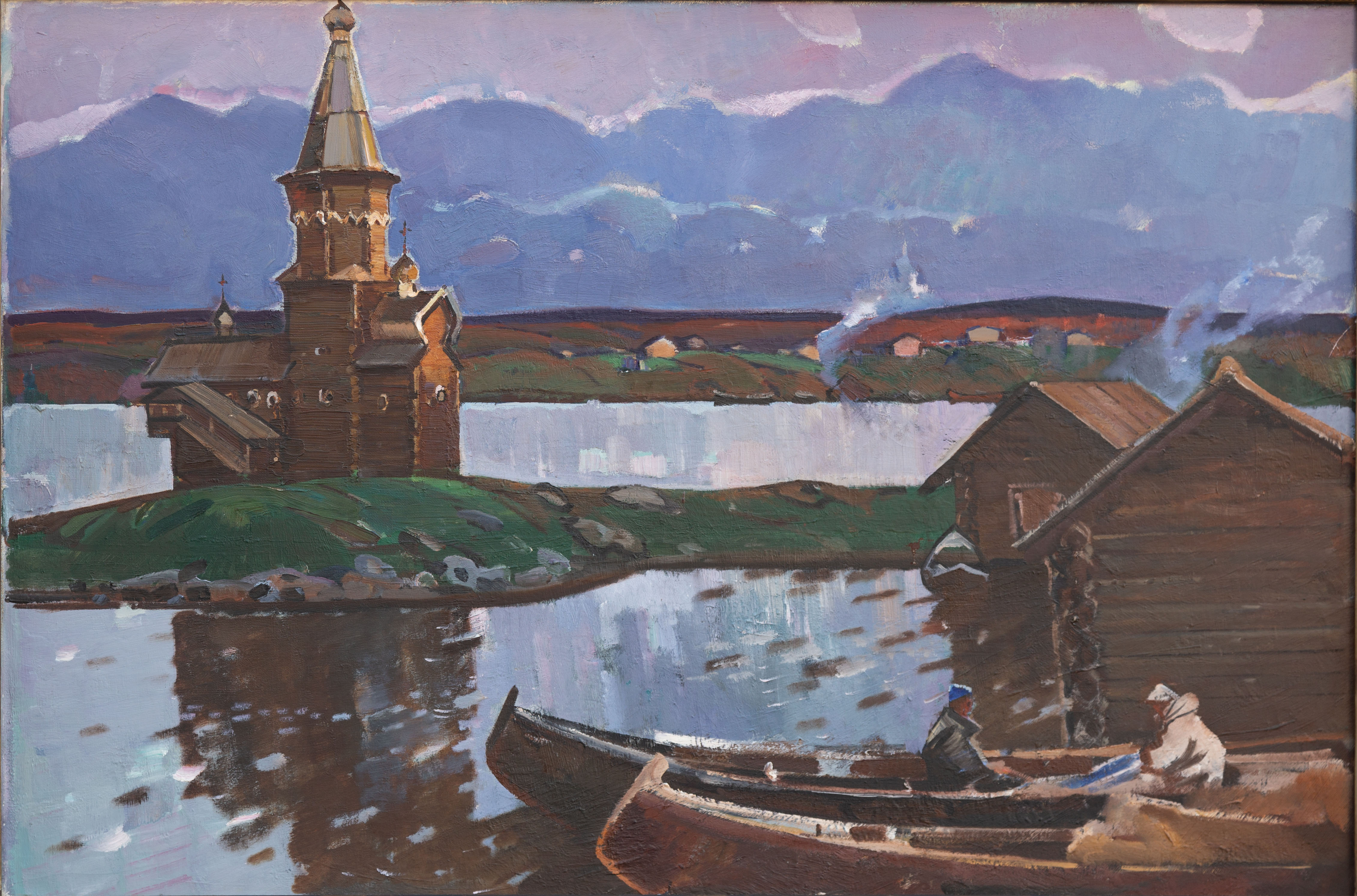 Картина «В Кондопоге» (1960) ленинградского живописца Алексея Еремина по всей видимости создана в одну из первых поездок художника в Карелию. Написанная энергично сочным широким свободным мазком, она изображает главную достопримечательность города – Успенскую шатровую деревянную церковь, построенную в 1774 году, к сожалению полностью сгоревшую 10 августа 2018 года. Решение об ее восстановлении уже принято.