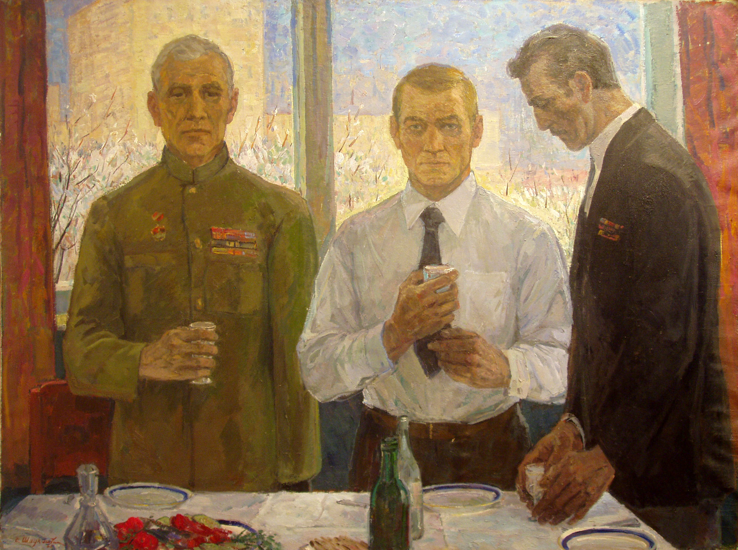 Картина Отари Шиукашвили «Однополчане» показывает суровое мужское братство мужественных людей, положивших свою молодость на защиту Родины. Они и сейчас, собравшись в День Победы 20 лет спустя (картина написана в 1960-е гг.), стоят плечом к плечу, с горечью вспоминая своих однополчан не вернувшихся с войны.