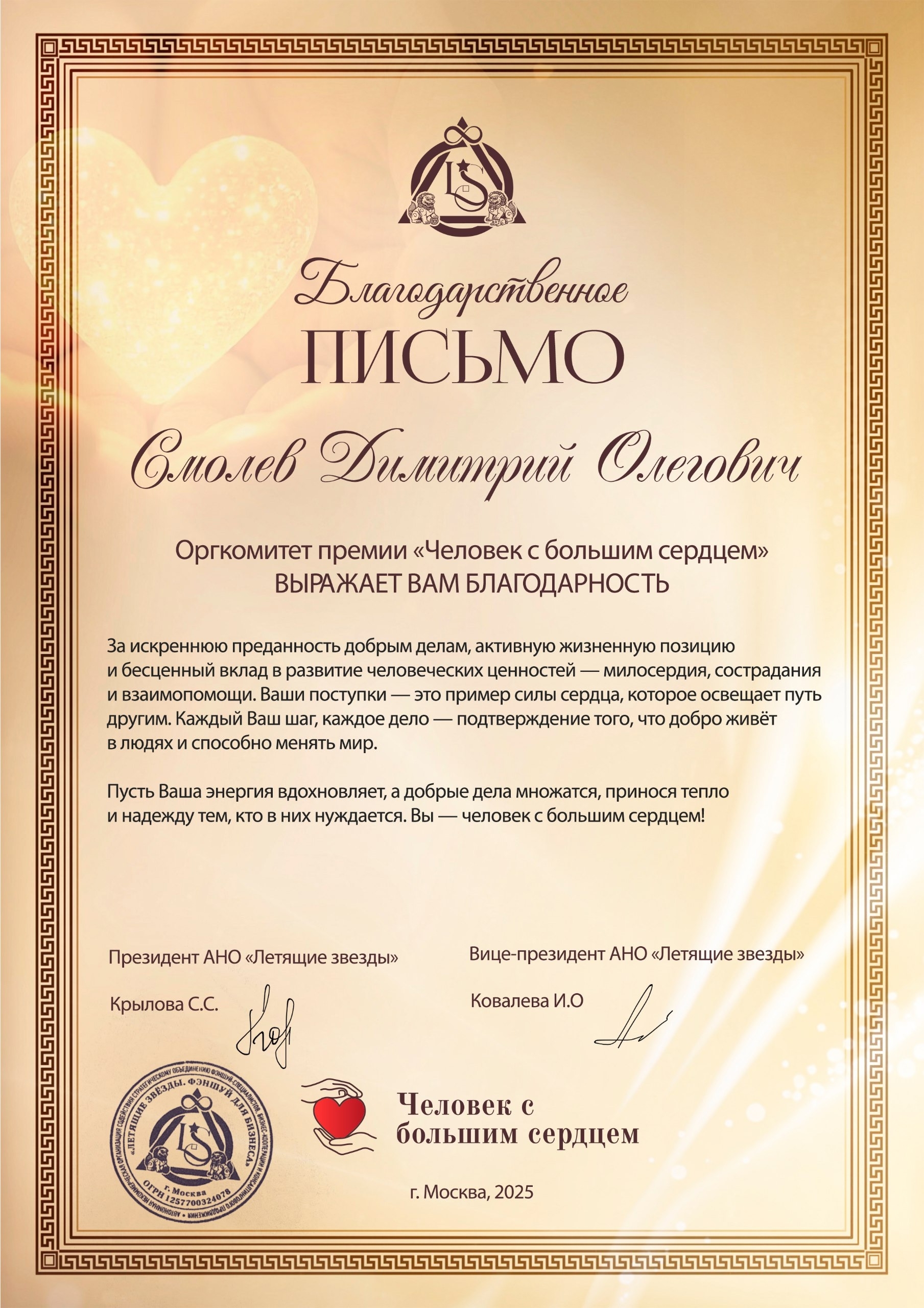 Премия «Человек с большим сердцем» — это российская награда, учреждённая для признания заслуг людей и организаций, которые активно занимаются благотворительностью, волонтёрством, социальным предпринимательством, а также вносят вклад в воспитание и поддержку общества, делая мир добрее своими бескорыстными поступками. Премия собрала более 1 000 участников из 89 субъектов нашей страны.