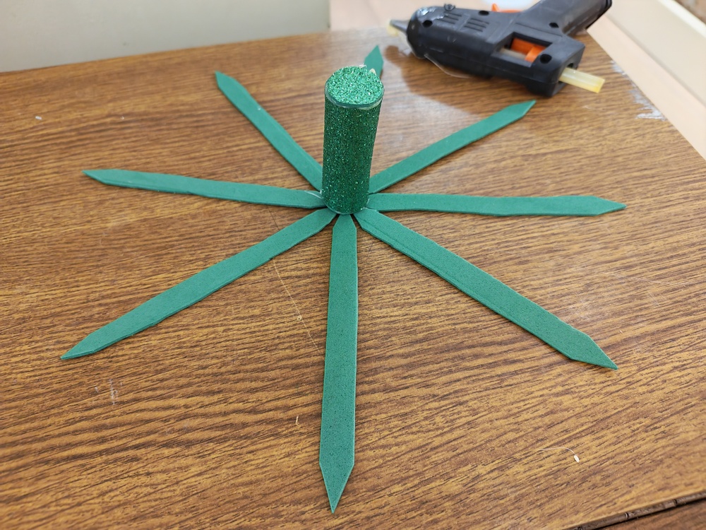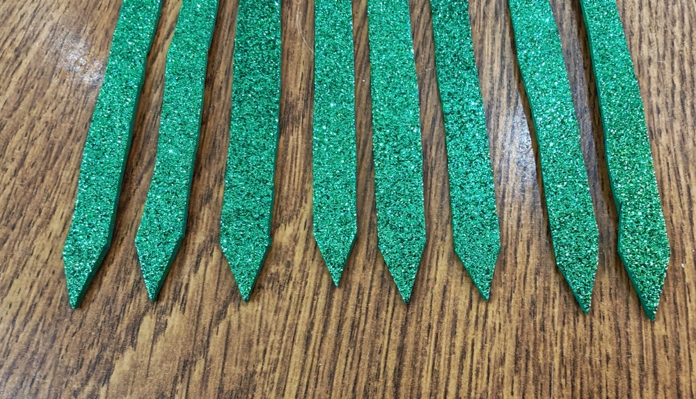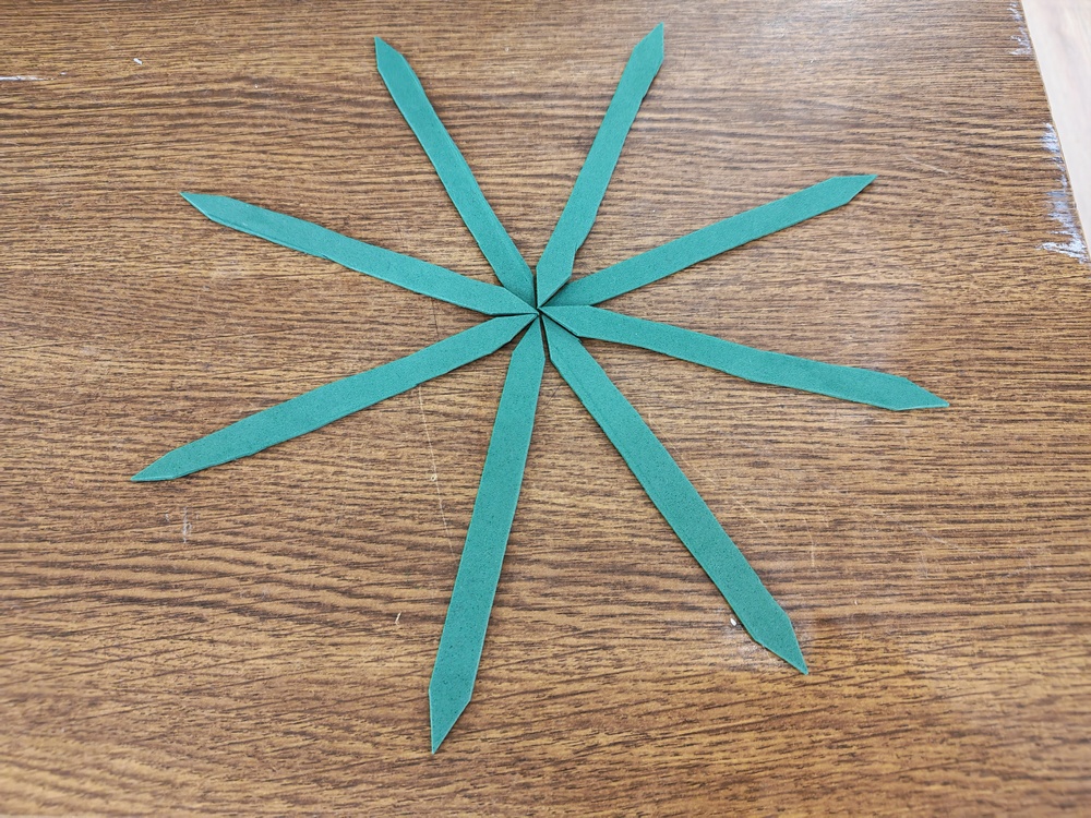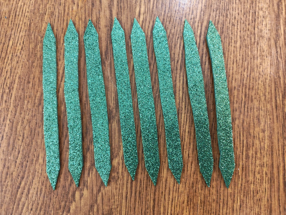 Возьмите 8 полосок и с обеих сторон каждой срежьте уголки, чтобы у вас получились зубчики, как показано на фотопримере.