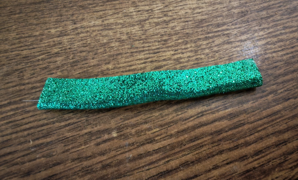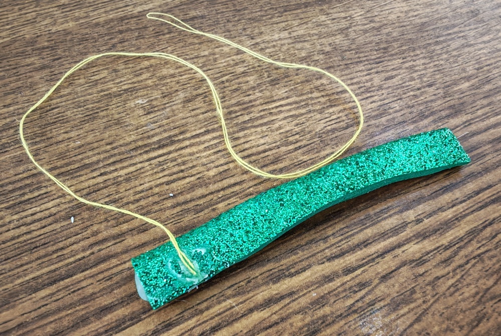 Полоску 7 на 2 см сложите вдвое и склейте. С одного из углов разместите нитку (на неё вы потом повесите игрушку).