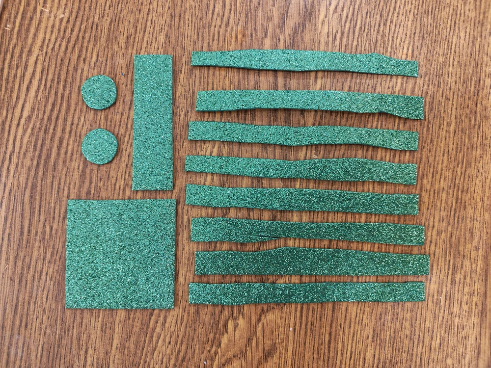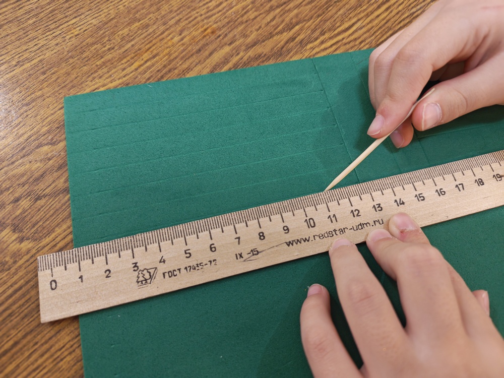 Переверните его (вам нужна не блестящая сторона) и с помощью линейки и зубочистки нарисуйте контуры нужных заготовок для шарика: 8 полосок длиной 12 см, а шириной 1, один квадратик 5 х 5 см, одну полоску 7 х 2 см и два кружка диаметром 1,5 см.
