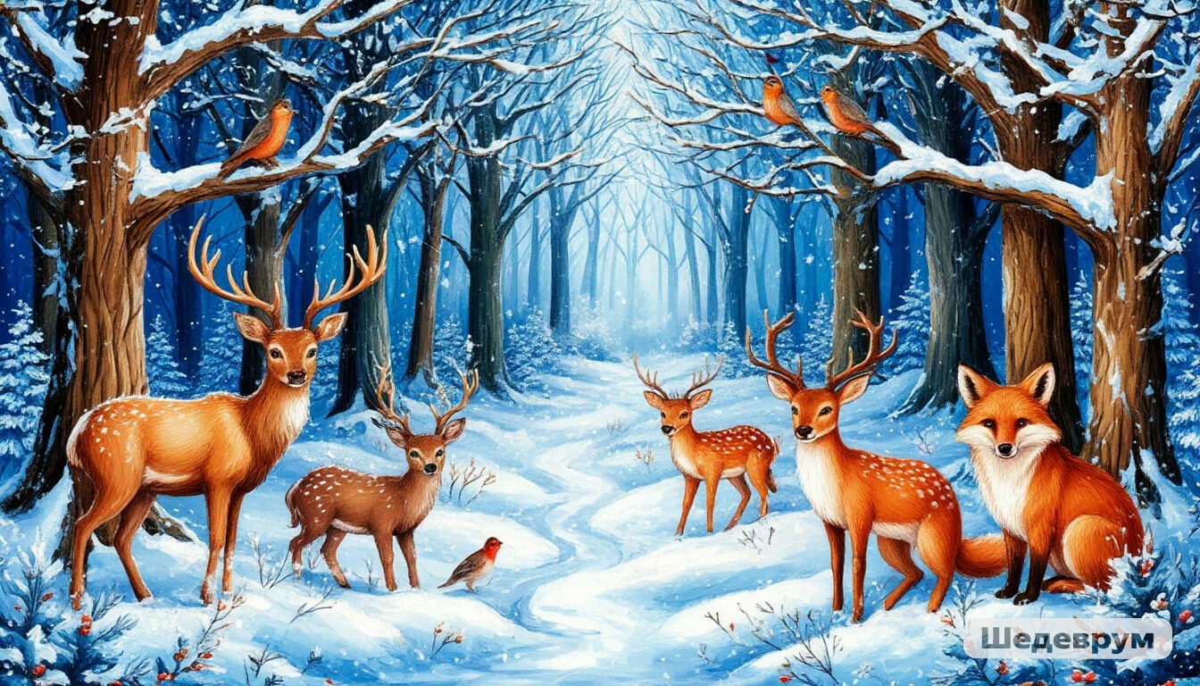Наступила зима. Ели одели свои белые шубки и мягкие шапочки, берёзы нарядились в кружевные платья, серебряными кофточками украсили себя осины.
