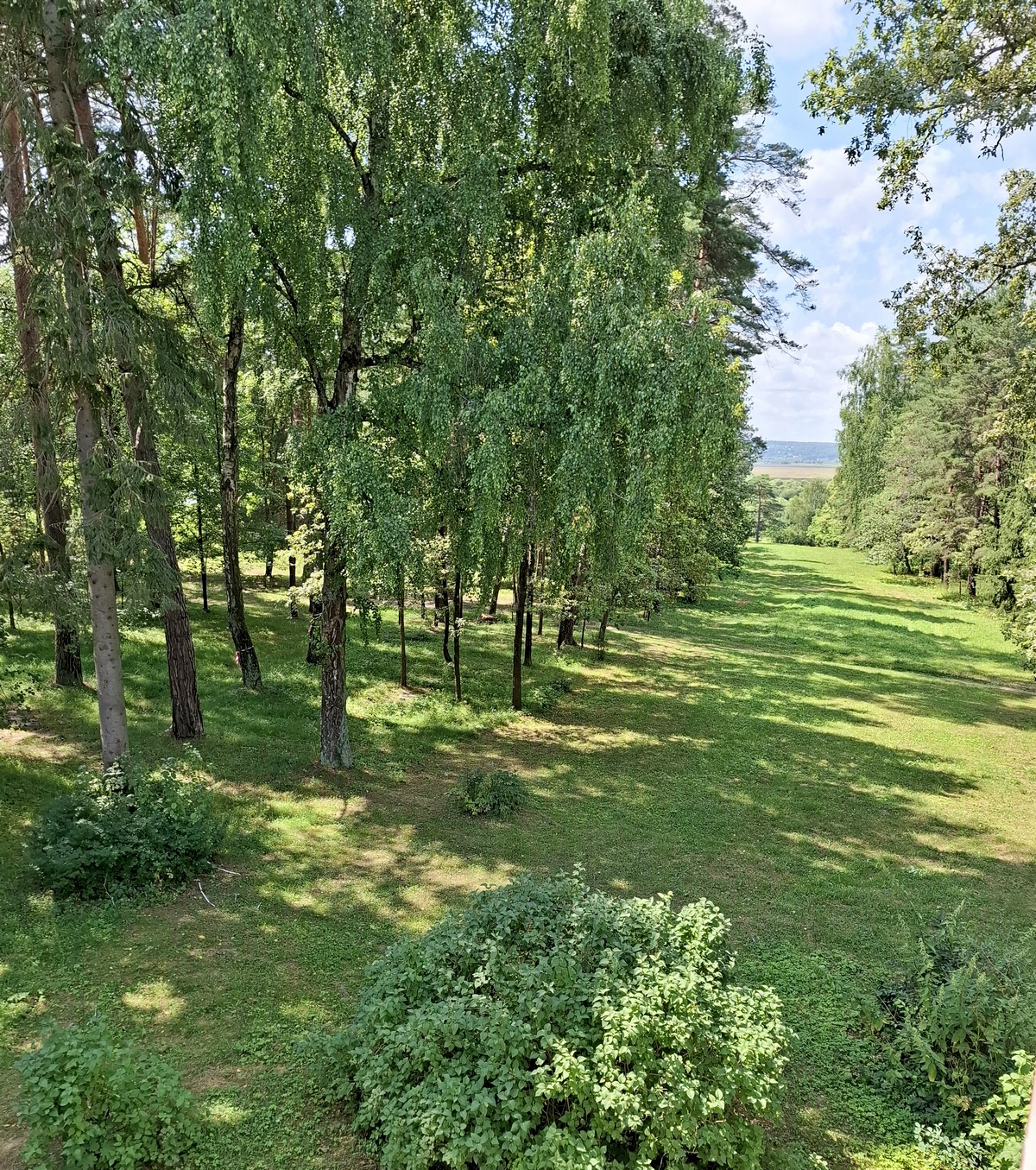 Расстояние в 100 километров преодолели быстро. И вот мы в доме, где жил мастер. Экскурсия. Интересный, увлекательный рассказ экскурсовода. На улице очень жарко. В доме также очень душно. Окна открыты настежь. Из окон, действительно, открывается чудесный вид, в какую сторону ни посмотри. Я всё стараюсь увидеть Оку. Это мне удаётся. Где‑то на расстоянии километра сквозь пространство в деревьях открылась большим голубым пятном её вода.