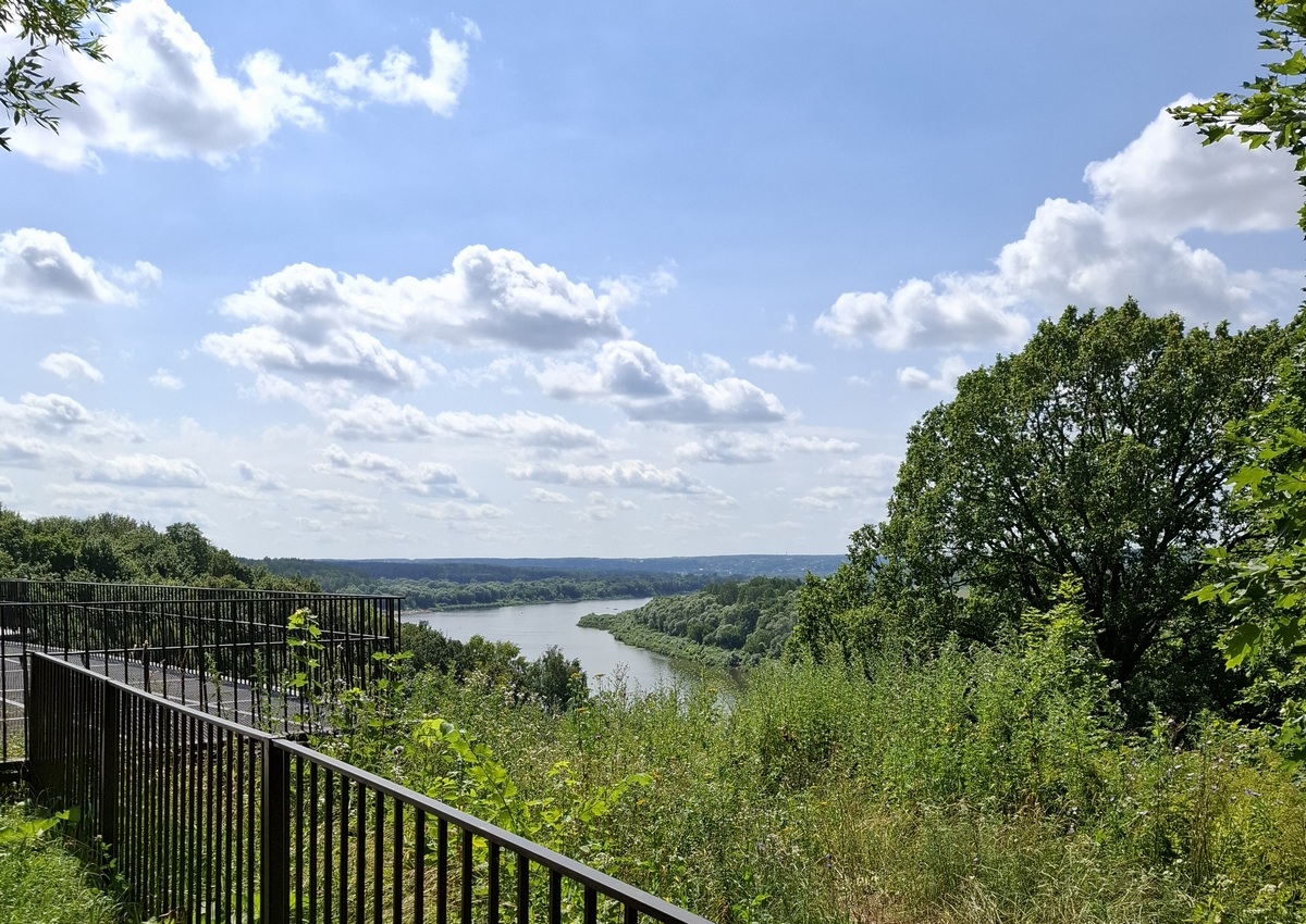 Я пытаюсь в смотровой бинокль увидеть Тарусу, но практически не получается, так как городок утопает в зелени. А вот верхушки некоторых храмов и колоколен рассмотреть удалось. Оказывается, после опустошительного пожара XVIII века, уничтожившего значительную часть городских построек, архитекторы отстроили Тарусу заново, мастерски вписав город в окружающий пейзаж.