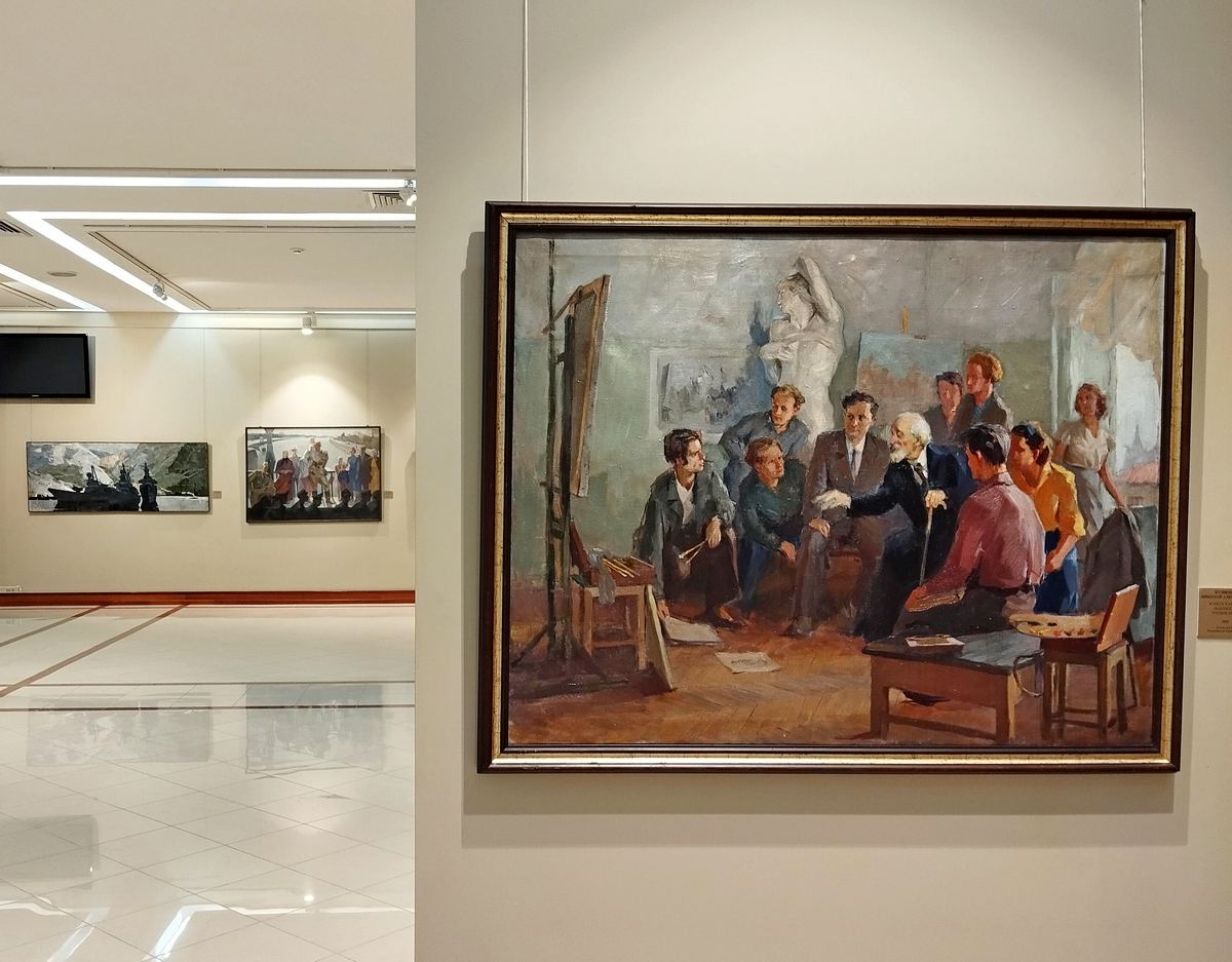 Здесь собраны не просто картины, а самые первые шаги великих мастеров. Это их учебные работы, дипломные эскизы и зарисовки, которые они делали, когда были ещё студентами. Вот, например, картина «В. Н. Бакшеев с учениками», которую написал Николай Кузнецов более 70 лет назад!