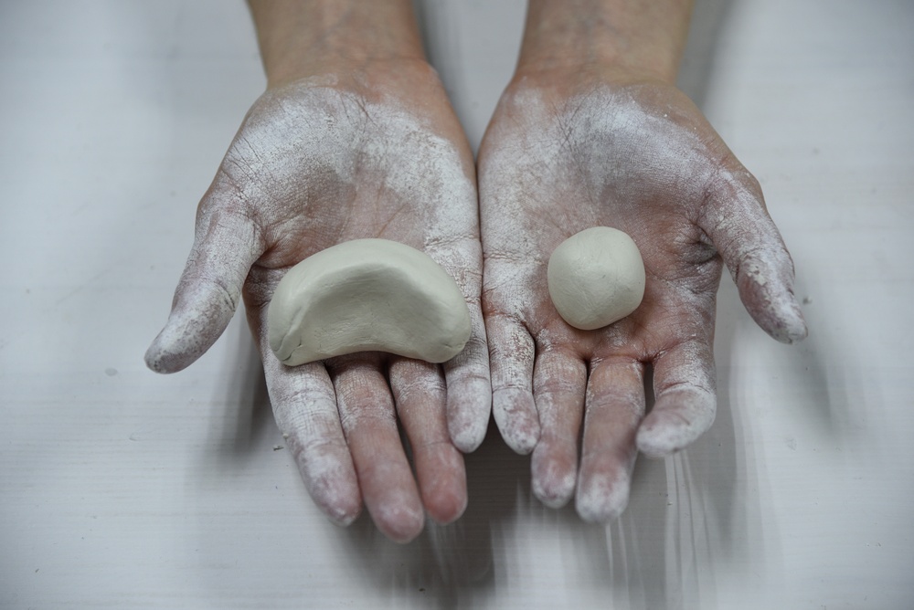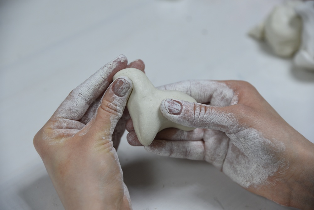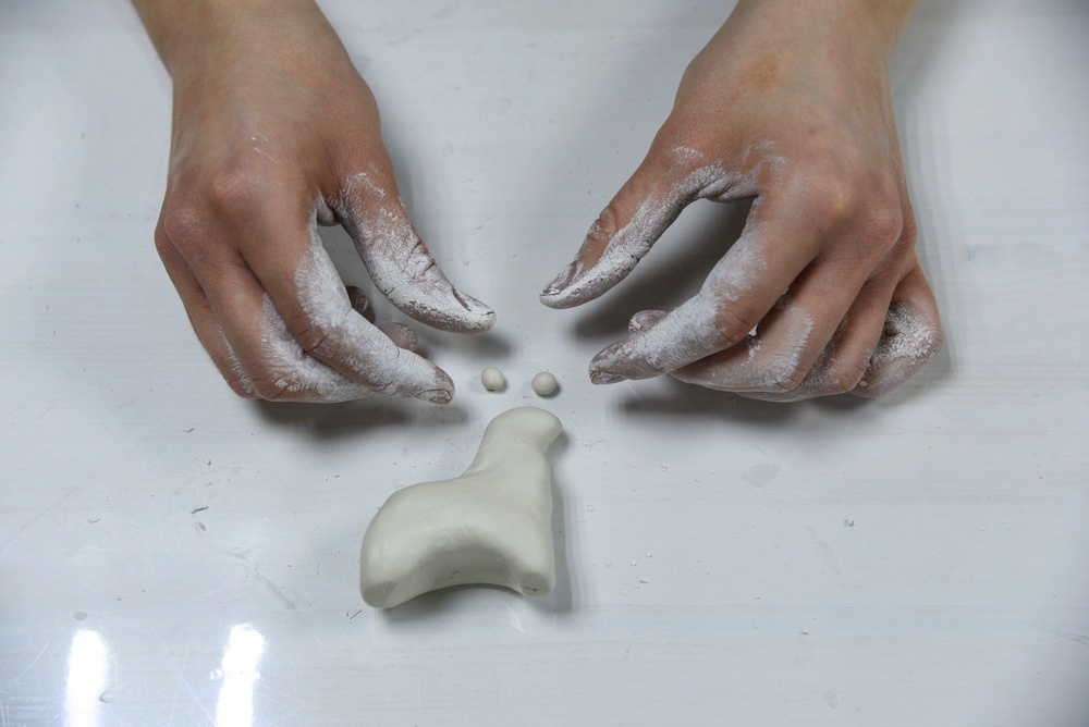 Смочив руки водой, разомните глину, чтобы она стала пластичной. Отделите кусок глины, чтобы слепить тело лошади. Вначале скатайте из него шарик, затем придайте ему овальную вытянутую форму. И в конце – согните тело лошади, сделав своеобразную дугу.