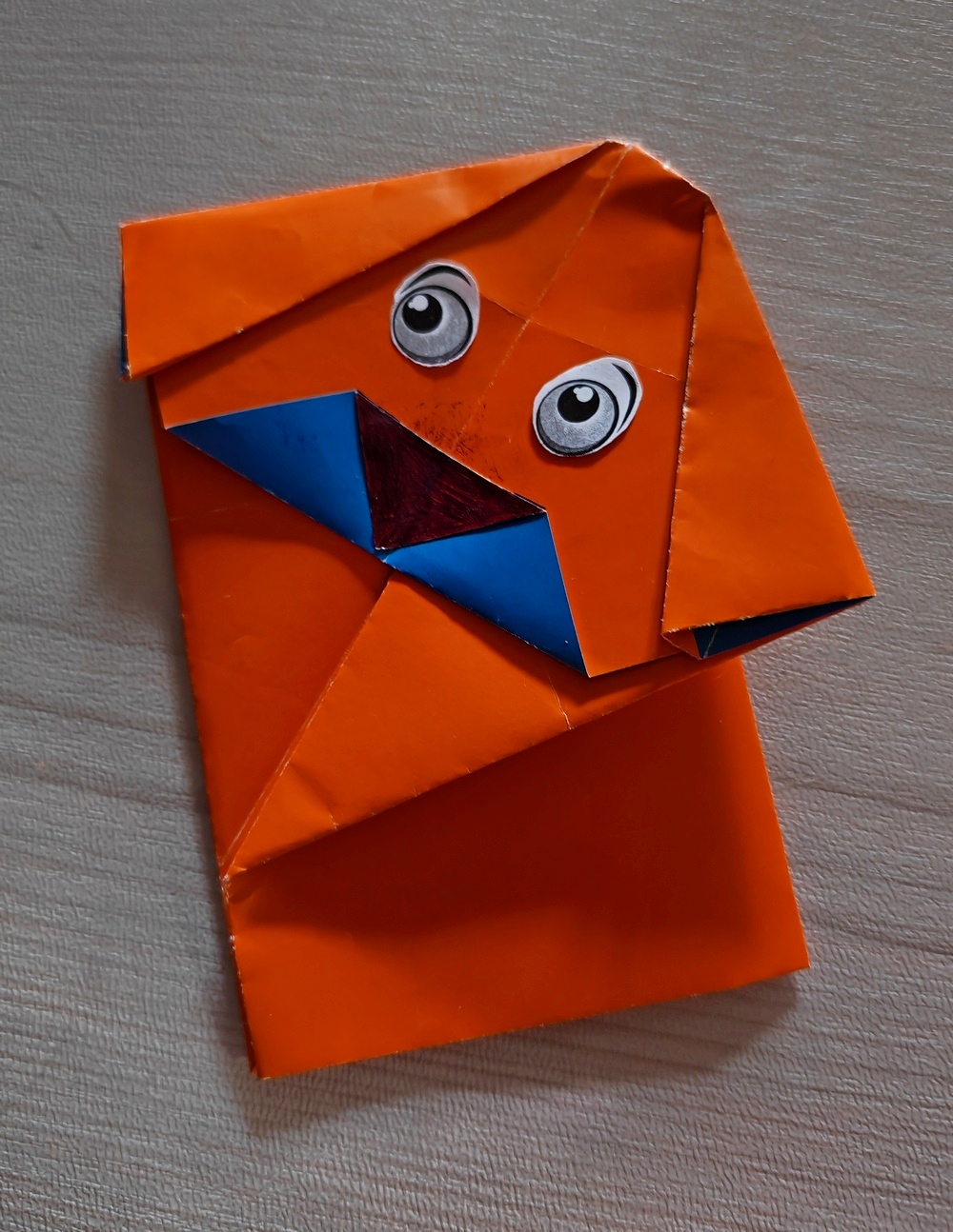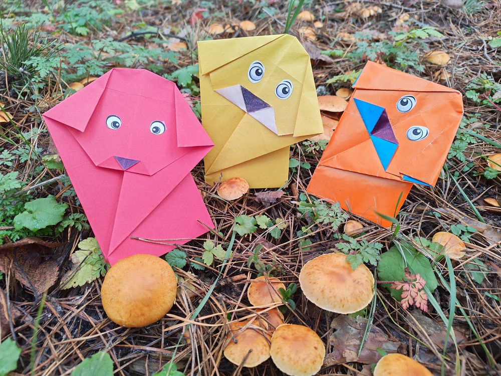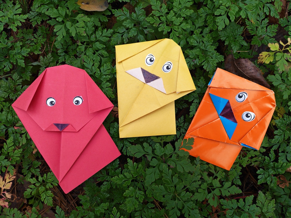 Можете ещё немного подразмять свои ручки и сложить бумажной собачке парочку ярких друзей. Кстати, бумажные фигурки можно легко поставить на ровную поверхность.