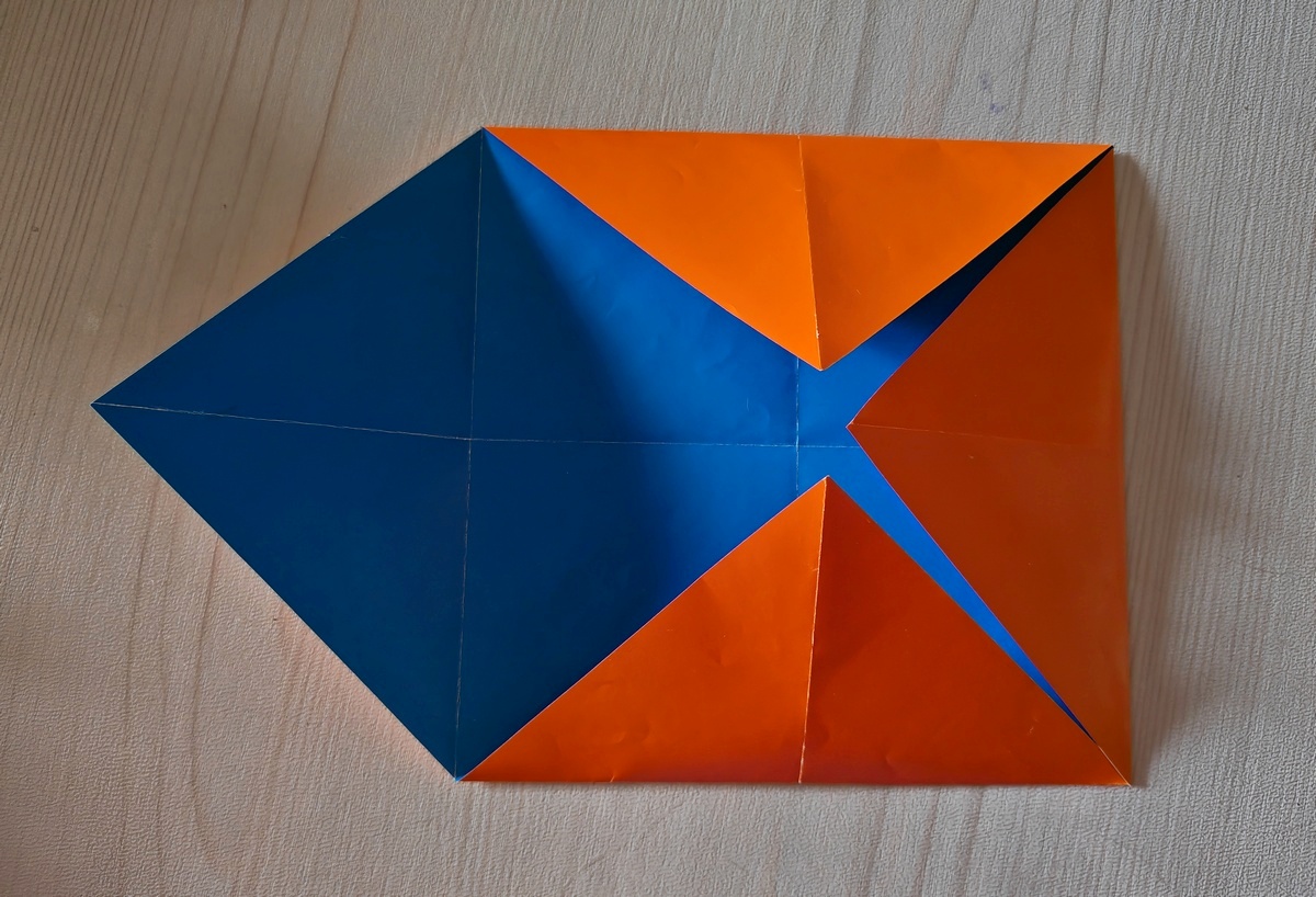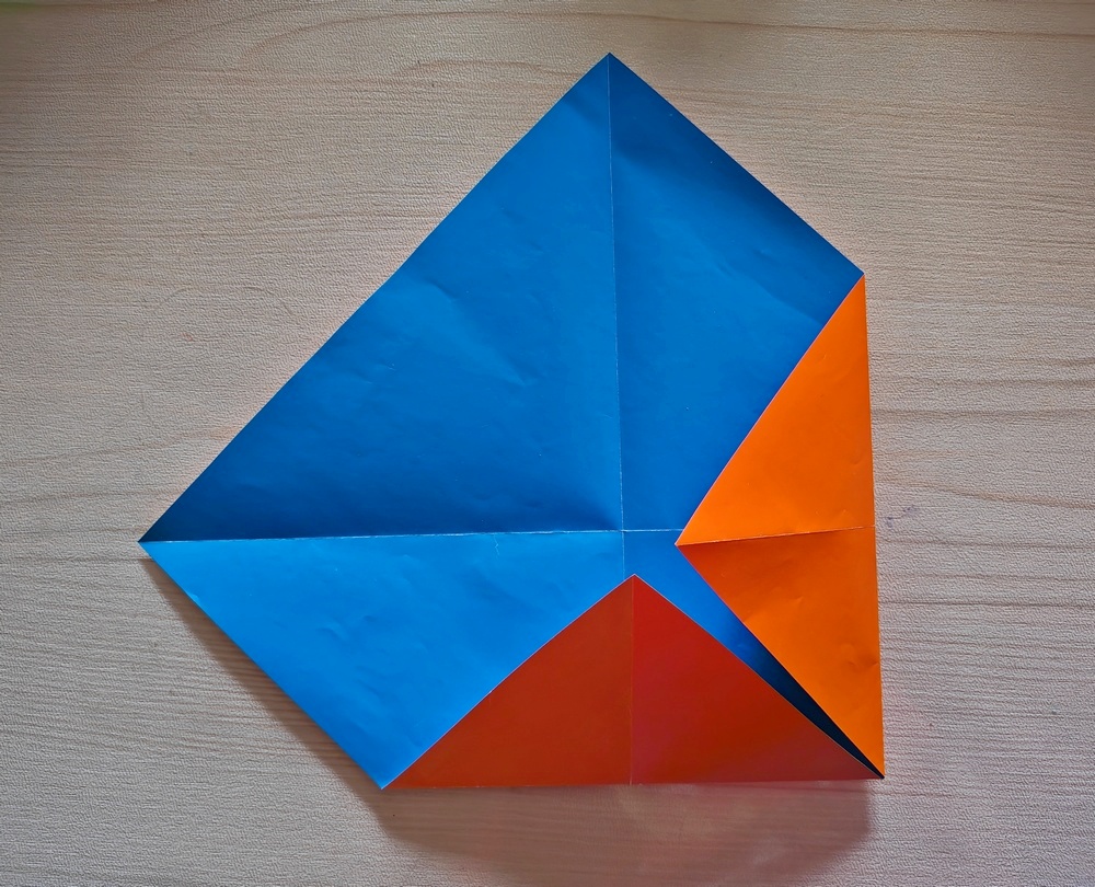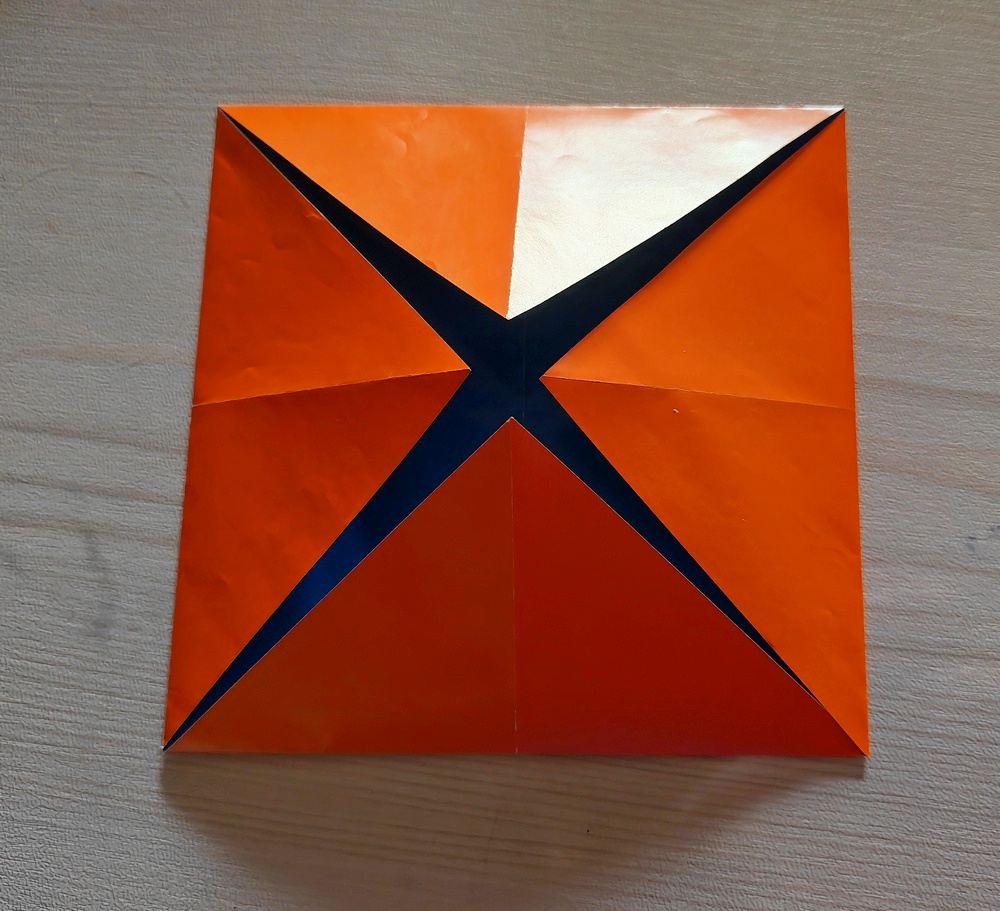 Разверните вашу бумажную заготовку и поочерёдно подогните к центру все четыре уголка детали. В итоге у вас снова получится квадрат.