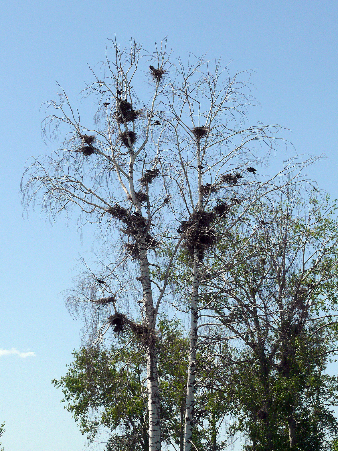 В птичьей стае свои правила: взрослые грачи устраивают свои «квартирки» в центральной части дерева, а вот молодым пернатым для обустройства гнёздышек оставляют места по краям.