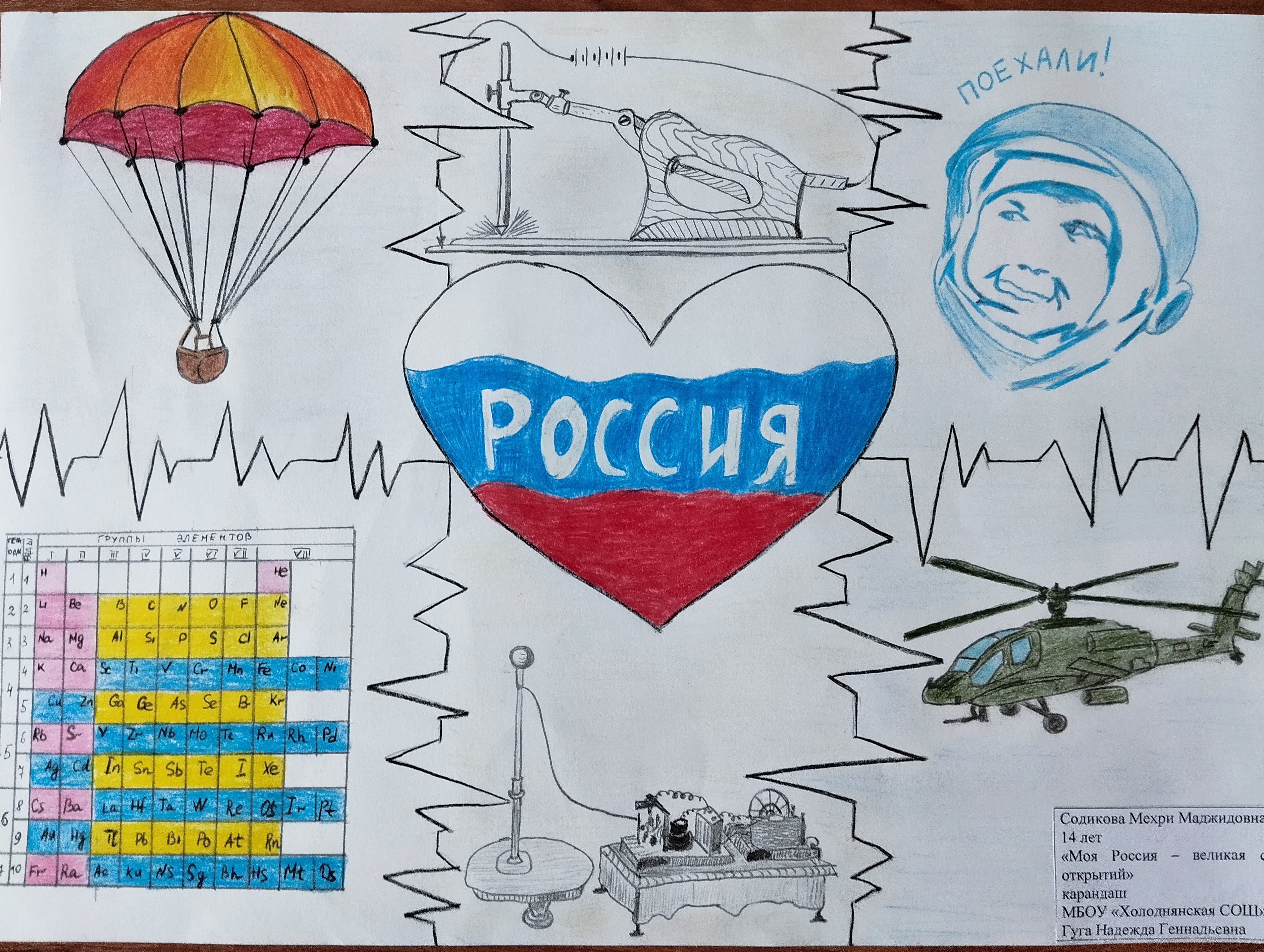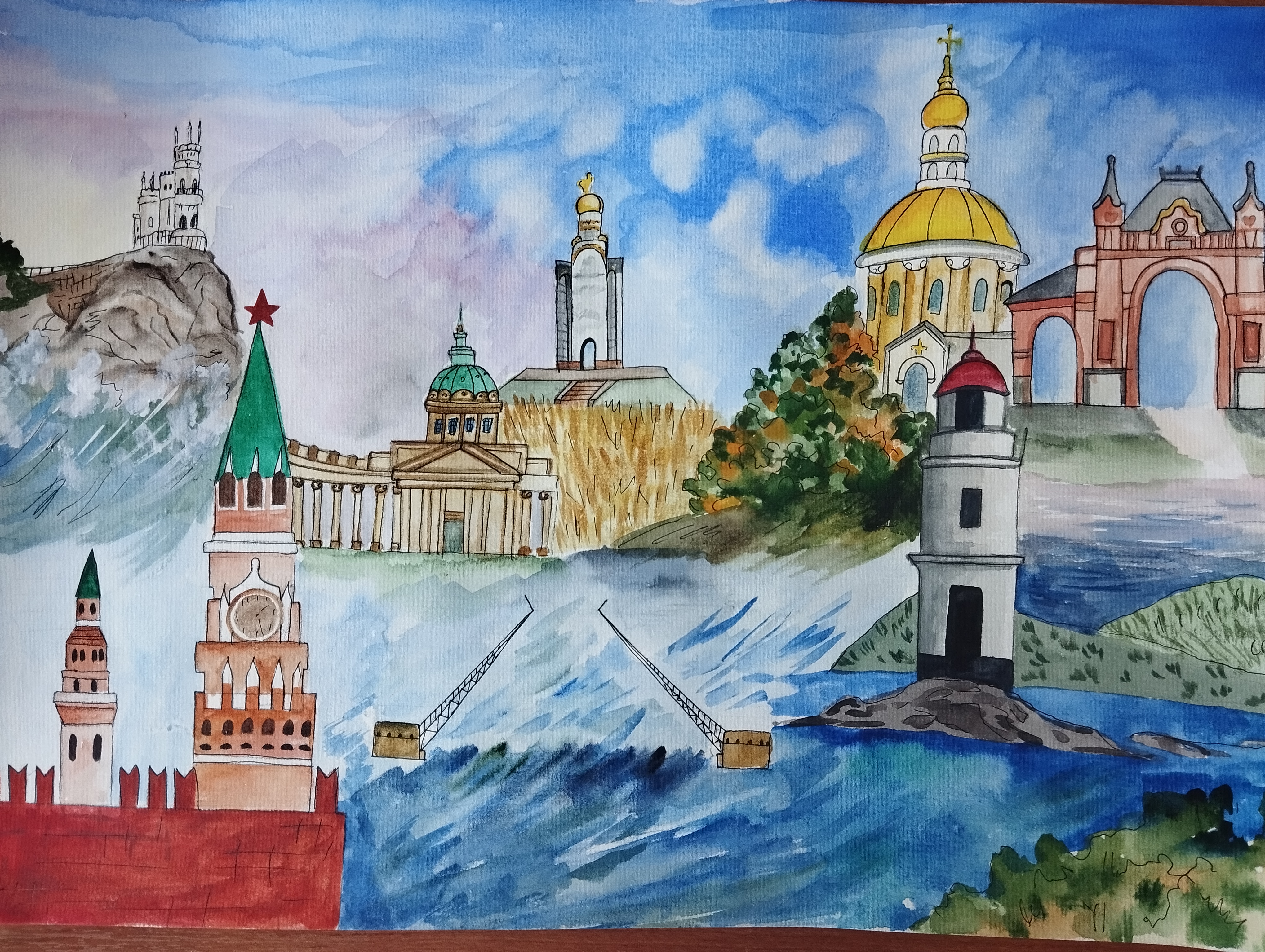 Юные художники изобразили главные открытия нашей страны, продемонстрировали красоту природы и архитектуры. Не забыли ребята и о главных символах России – русской матрёшке, белой берёзе, голубе.