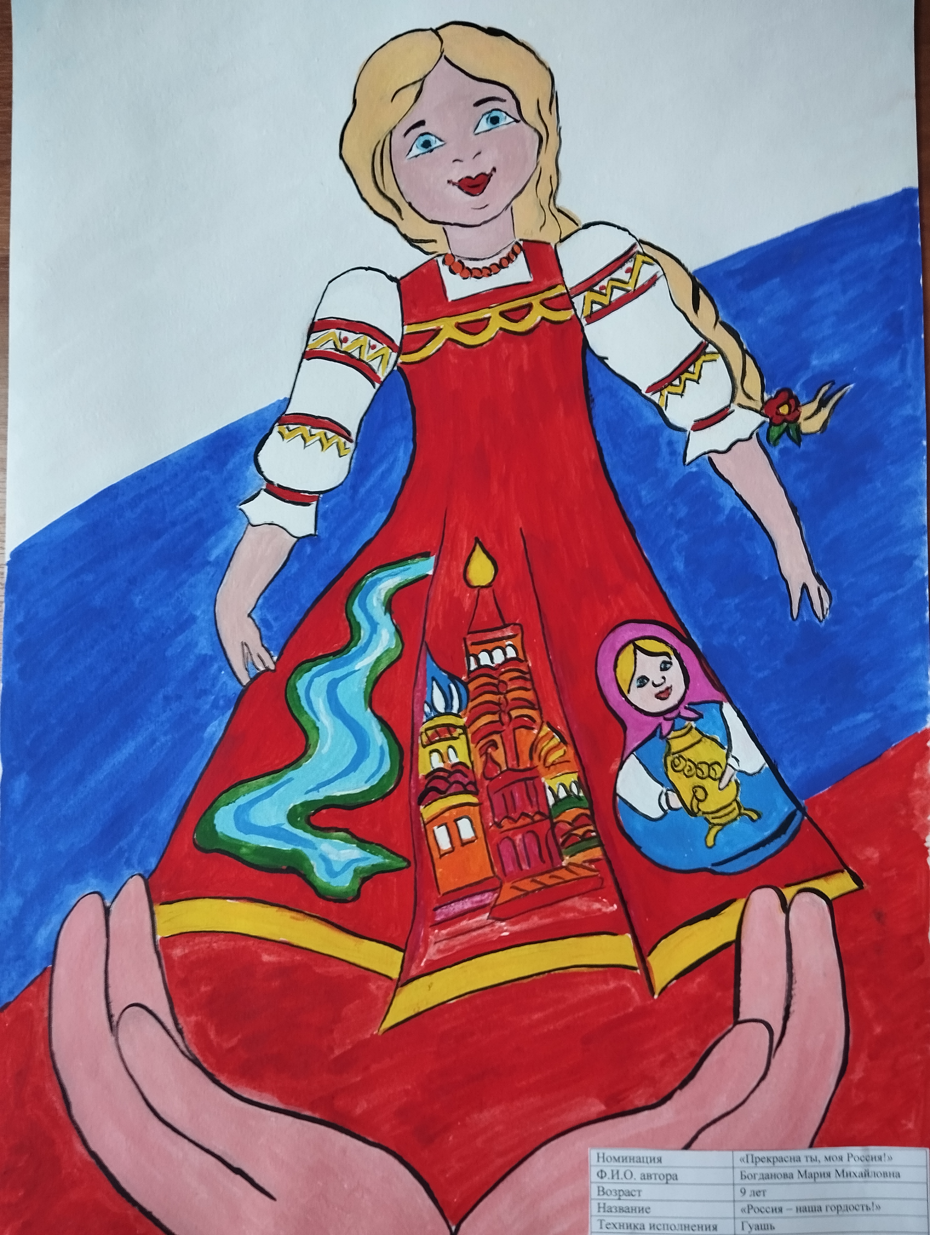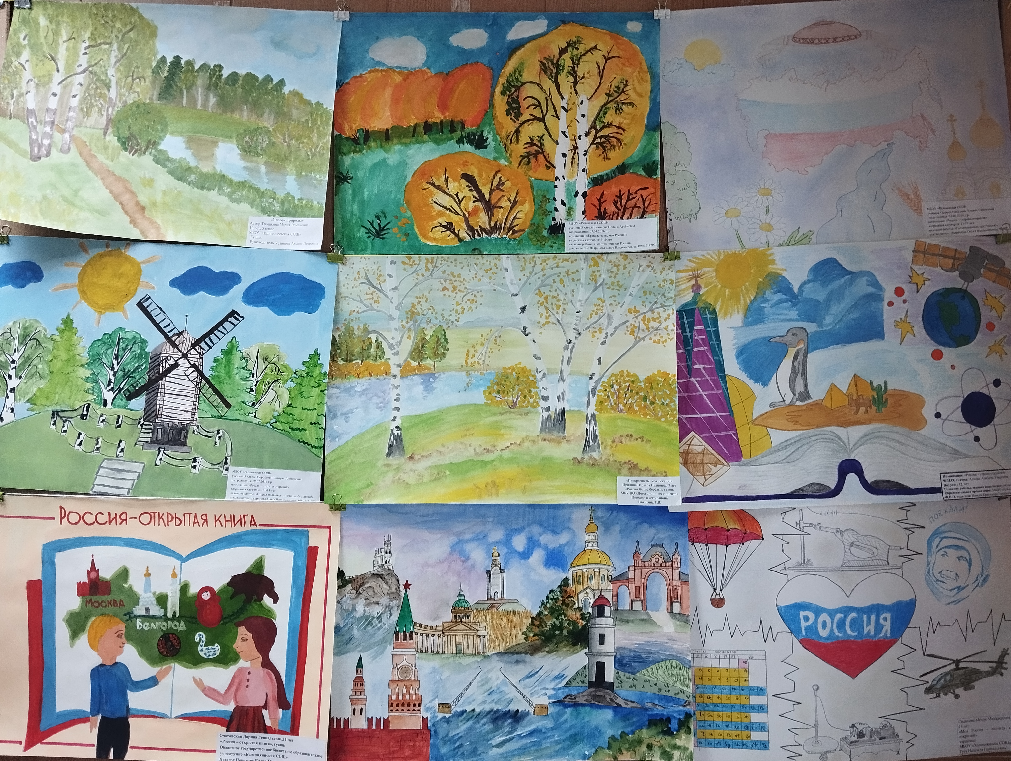 Всего представили 28 работ по номинациям: «Прекрасна ты, моя Россия!» (изобразительная деятельность, 7–10 лет), «Россия – страна открытий» (изобразительная деятельность, 11–14 лет) и «Моя страна – моё будущее» (литературное творчество, 14–17 лет).