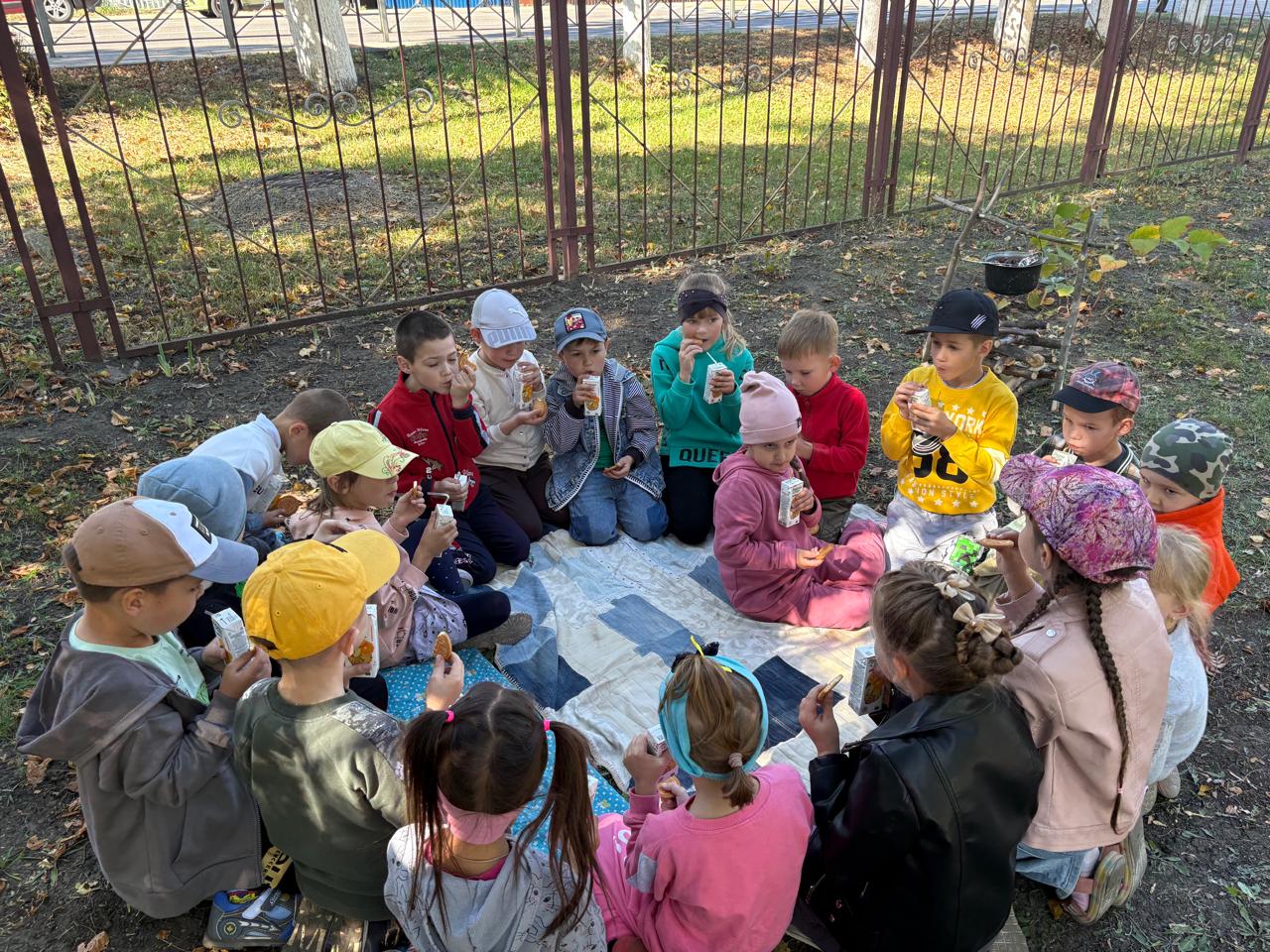 В завершение похода уставшие, но довольные юные туристы устроились на пикник, чтобы подкрепиться после насыщенного дня. Свежий воздух и активные игры разбудили аппетит: печенье и сок показались особенно вкусными.