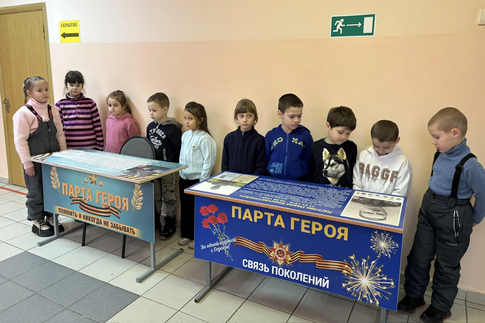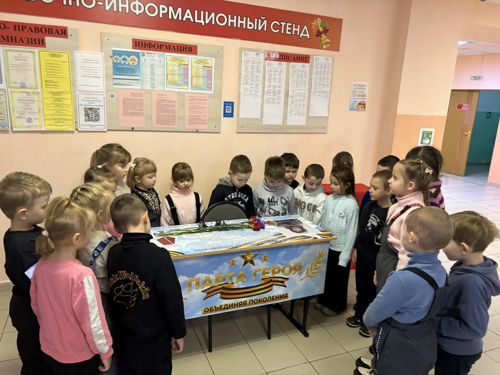 Внутри гимназии воспитанники возложили цветы к Партам Героев — особому символу мужества и самопожертвования тех, кто отдал свои жизни ради мира на нашей земле.