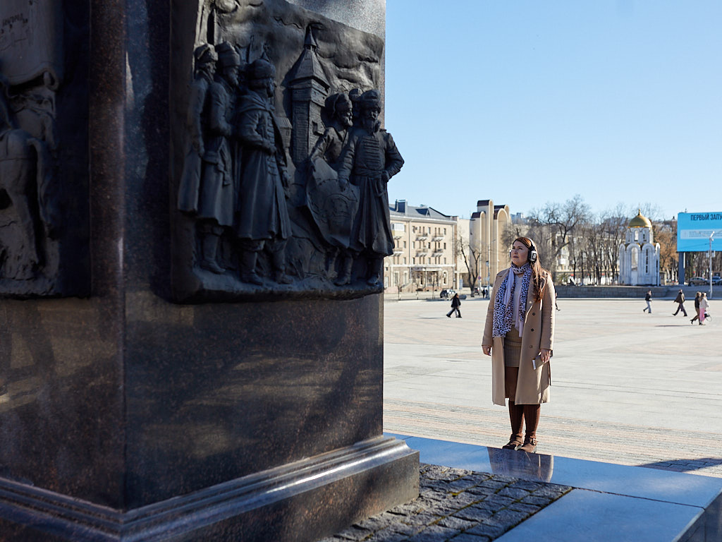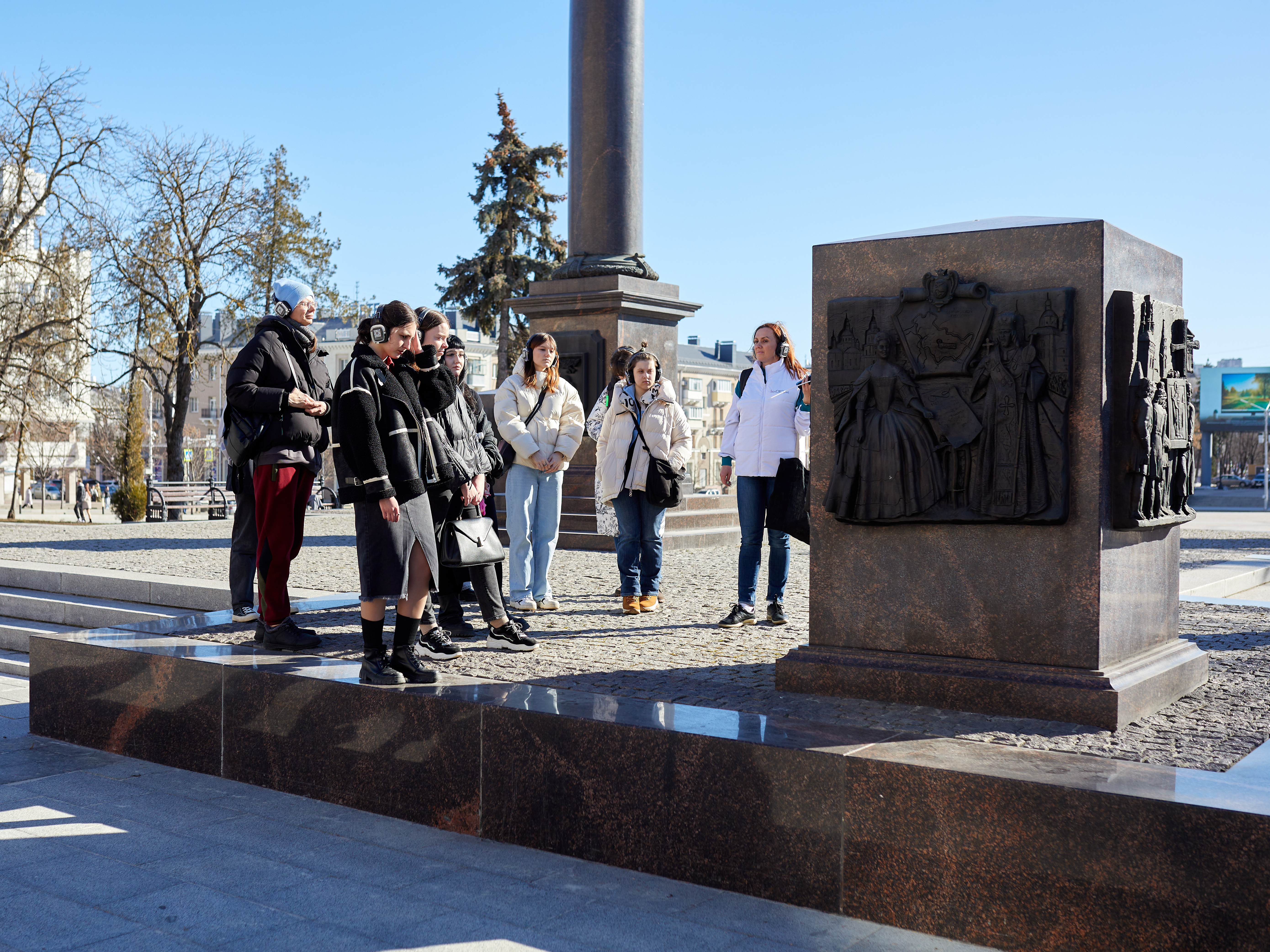 Сотрудница Белгородского центра туризма Инна Хопина выступает в роли экскурсовода и время от времени указывает на здания, о которых экскурсанты слышат рассказ в наушниках. Мы выходим на Соборную площадь и останавливаемся у стелы «Город воинской славы». Удивительно, но многие горожане, не единожды проходя мимо этого места, никогда не обращали внимание, что на угловых пилонах расположены барельефы, отражающие историю города. Мы рассматриваем их внимательно, параллельно слушая о создании Белгородской черты, участии Белгородского полка в сражении под Полтавой, образовании Белгородской губернии, служении святителя Иоасафа…