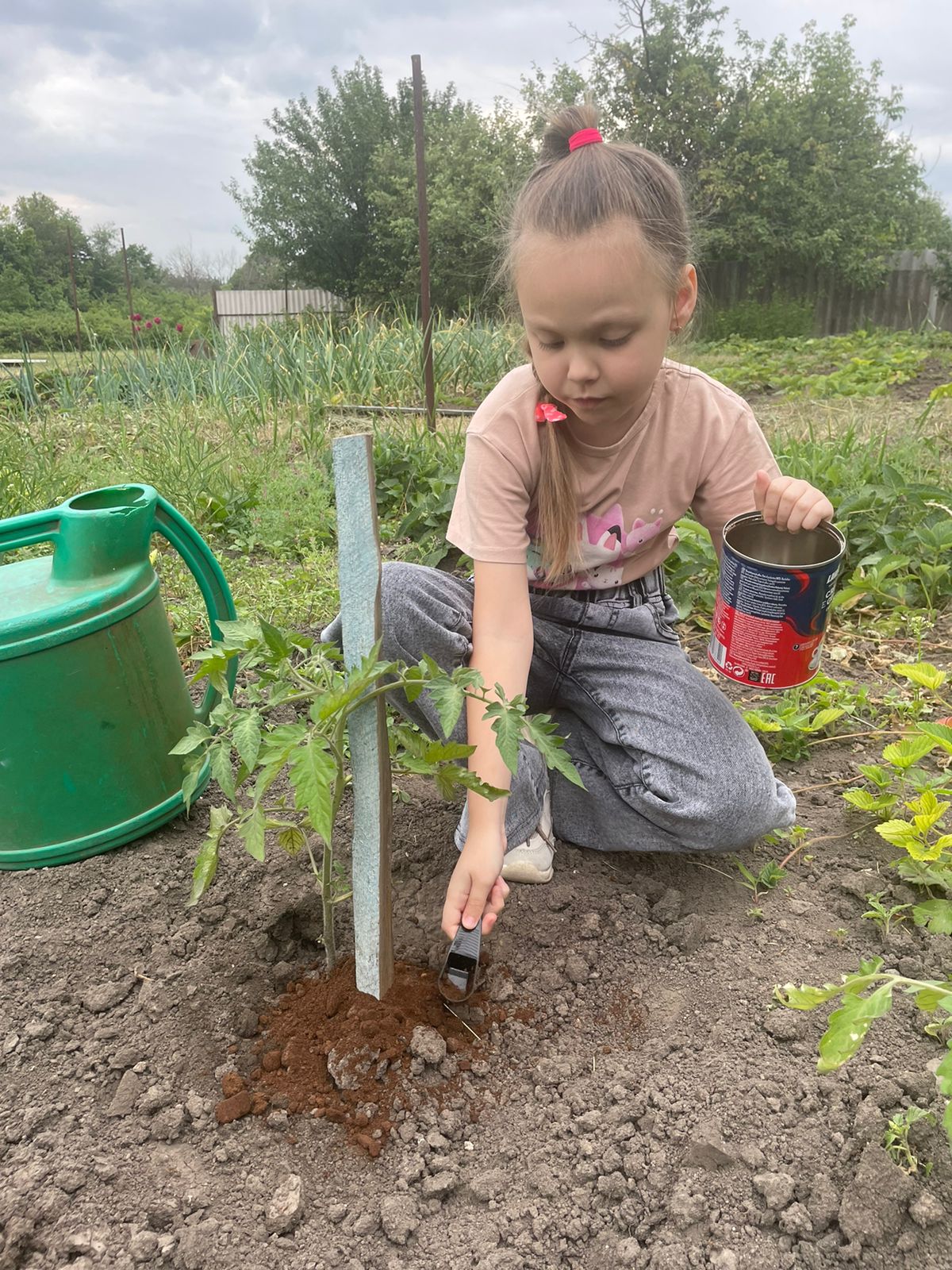 Для начала кофейную гущу Вика использовала на огороде. Она выбрала два куста помидоров. Один из них уже дал цветок, а другой – нет.