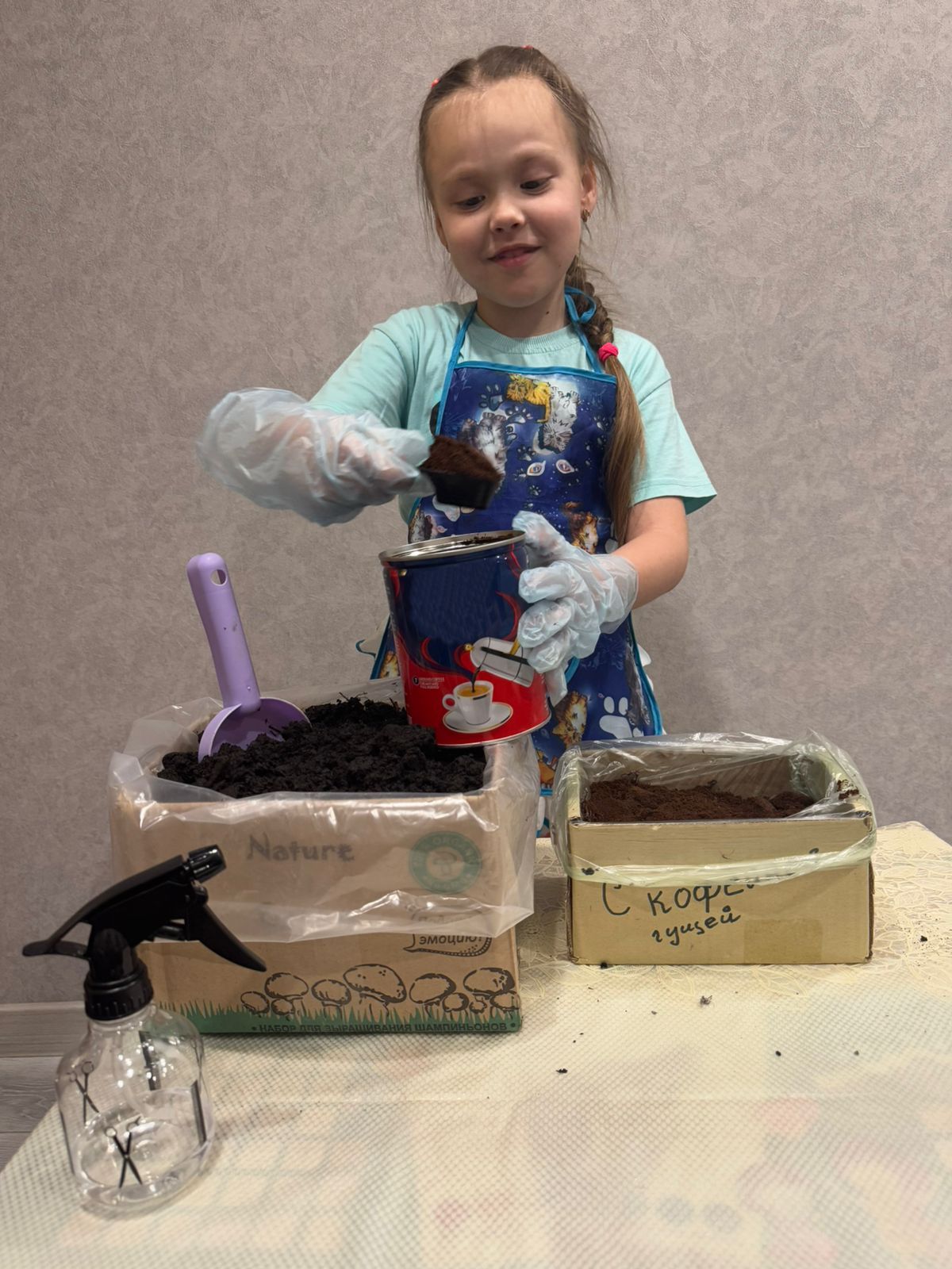Дальше Вика проверила, как кофейная гуща влияет на выращивание грибов. Для этого школьница заказала набор для посадки шампиньонов и подготовила две коробки:
