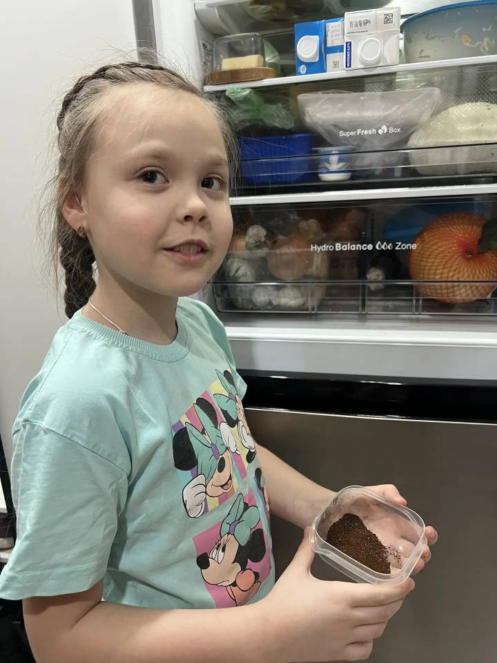 Второклассница высушила гущу, насыпала её в небольшую стеклянную баночку и поставила в холодильник. Также сделала мешочек из тонкой ткани, насыпала туда гущу и положила его в обувной шкаф.