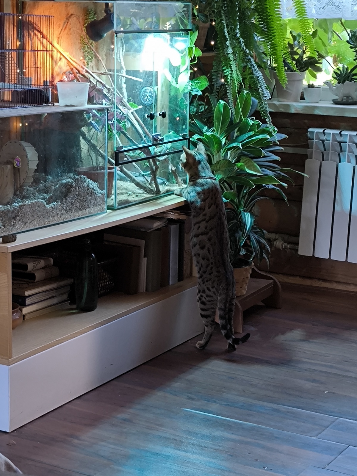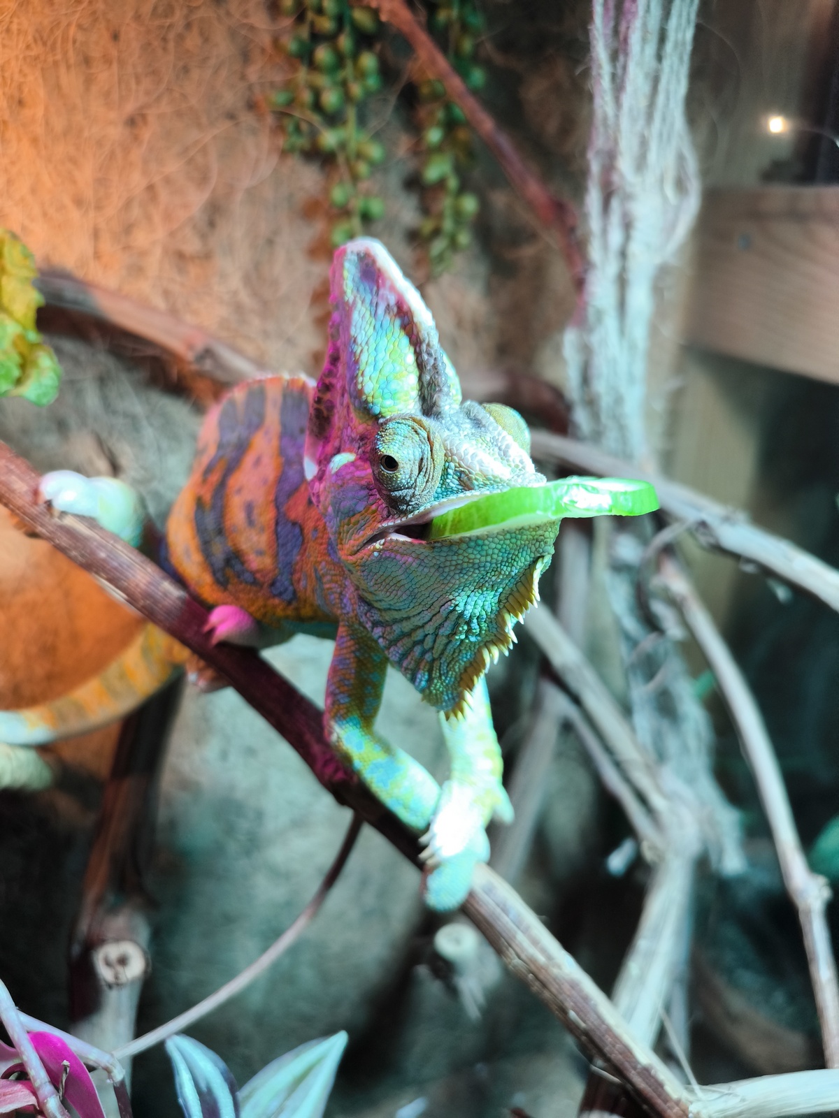 Вася живёт в просторном террариуме. Мы наполнили его виноградными ветками, чтобы хамелеон мог по ним лазать. Ещё ему нужны специальные лампы: одна, чтобы он мог греться, а вторая – ультрафиолетовая – замена солнца. Иногда мы пшикаем в террариум водой, чтобы повысить влажность.