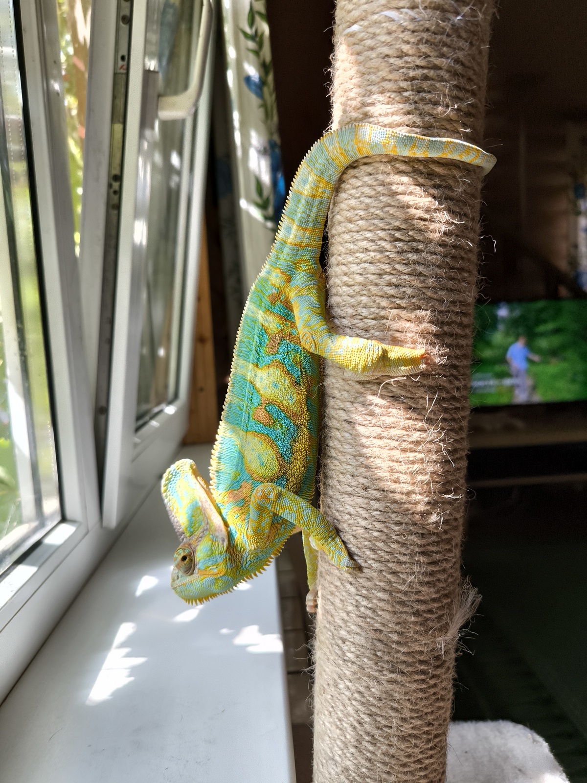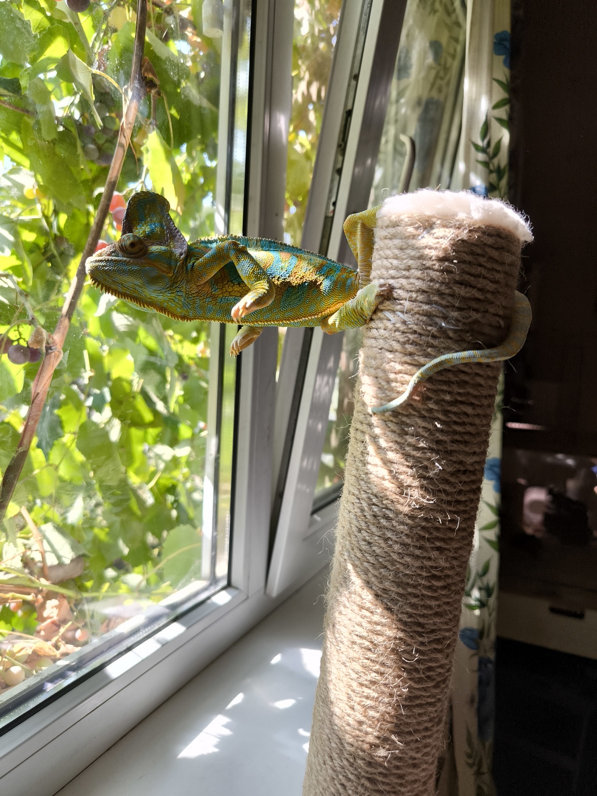 Время от времени мы выпускаем Васю погулять. Он лазает по канату, который протянут от террариума к окну. Любит висеть на карнизе и иногда там даже засыпает.