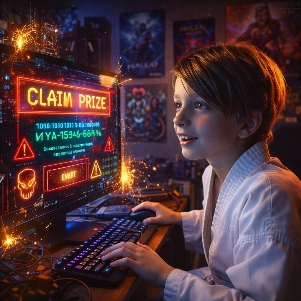Незнакомец кинул ссылку: «Здесь получишь все бонусы!» Не раздумывая, я кликнул по ней… Сайт выглядел почти как настоящий: те же цвета, логотип, только всё мигало и мелькали странные надписи. Я ввёл свой пароль и тут же забыл обо всём – меня позвали родители.